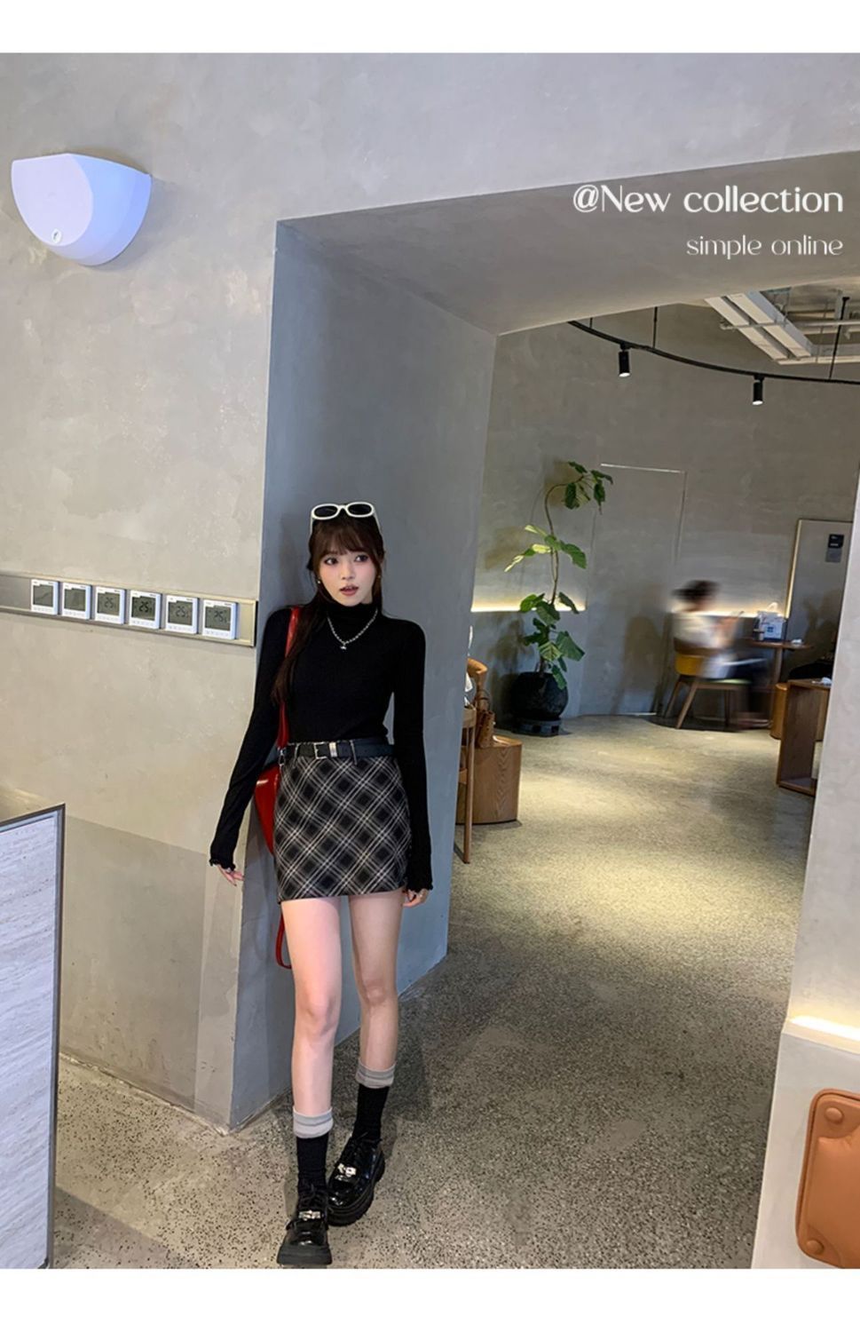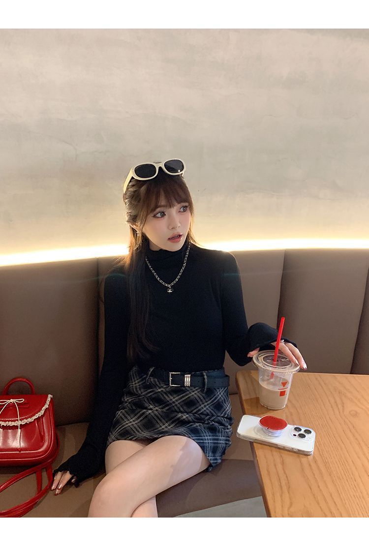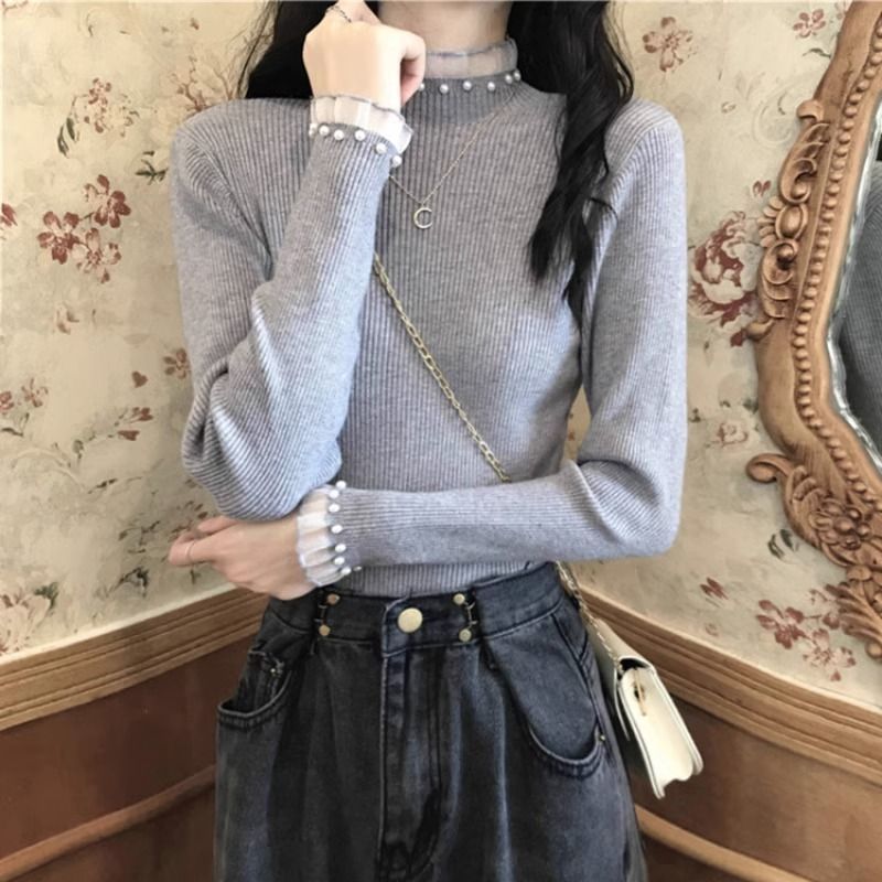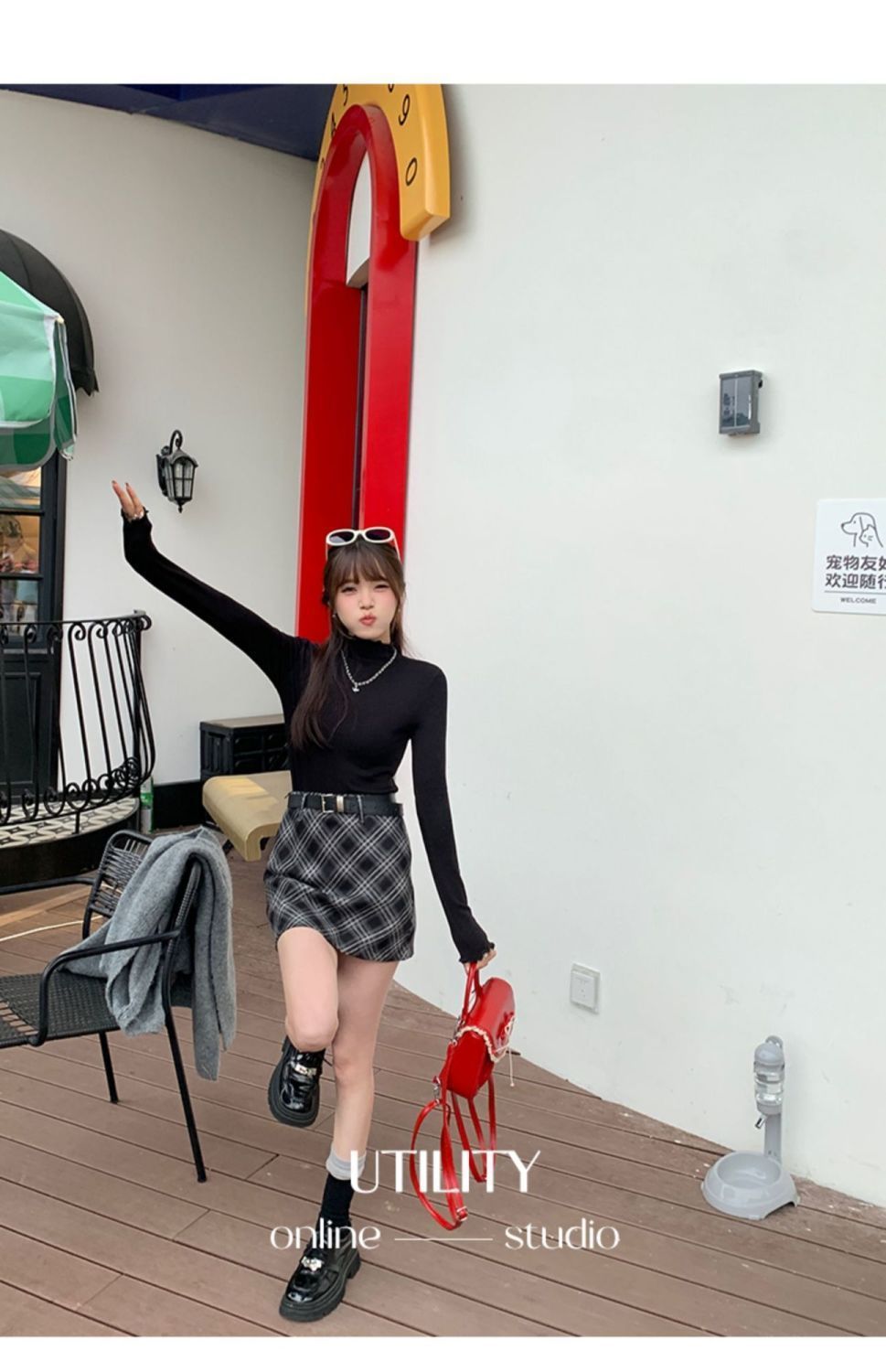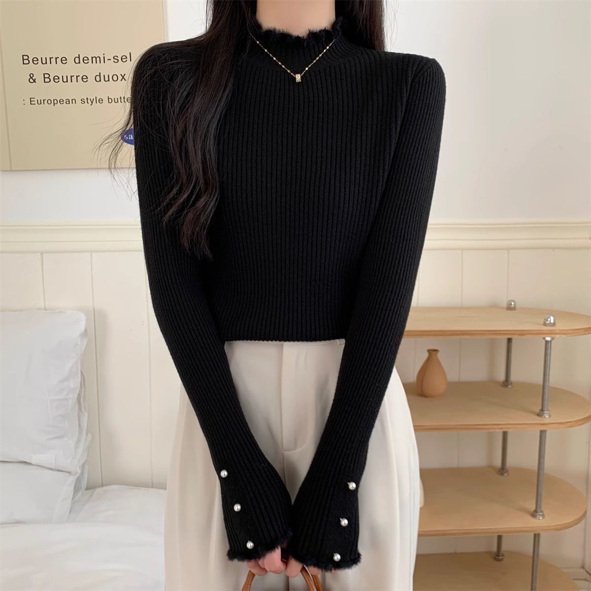 黒の半高襟のニットの底のシャツの女性の秋冬の新型の独特な玉の洋風の中で長袖の修身の上着の潮を掛けます。