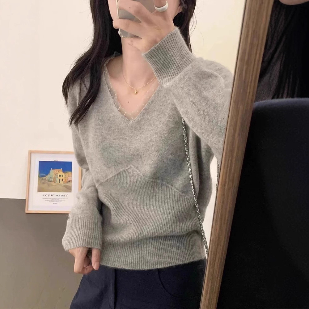 小香风韩系灰色V领波点蕾丝打底衫女式秋冬宽松羊毛衫针织内搭瘦