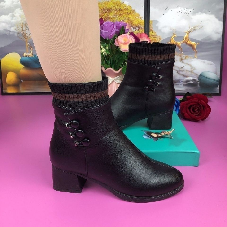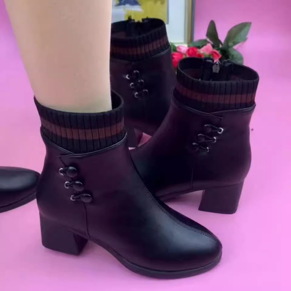 2025年秋冬季新款厚底粗跟软皮软底加绒中老年妈妈马丁靴耐磨棉靴