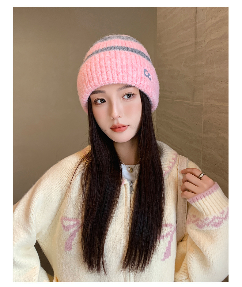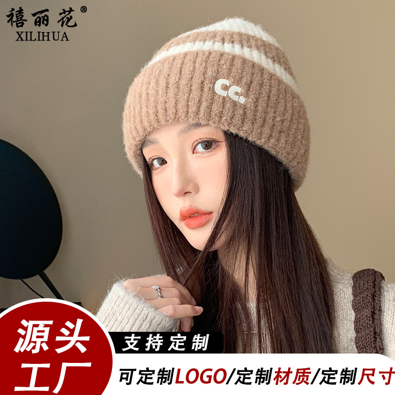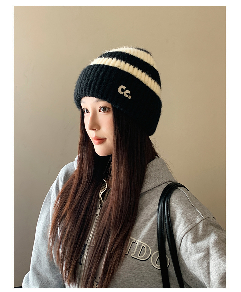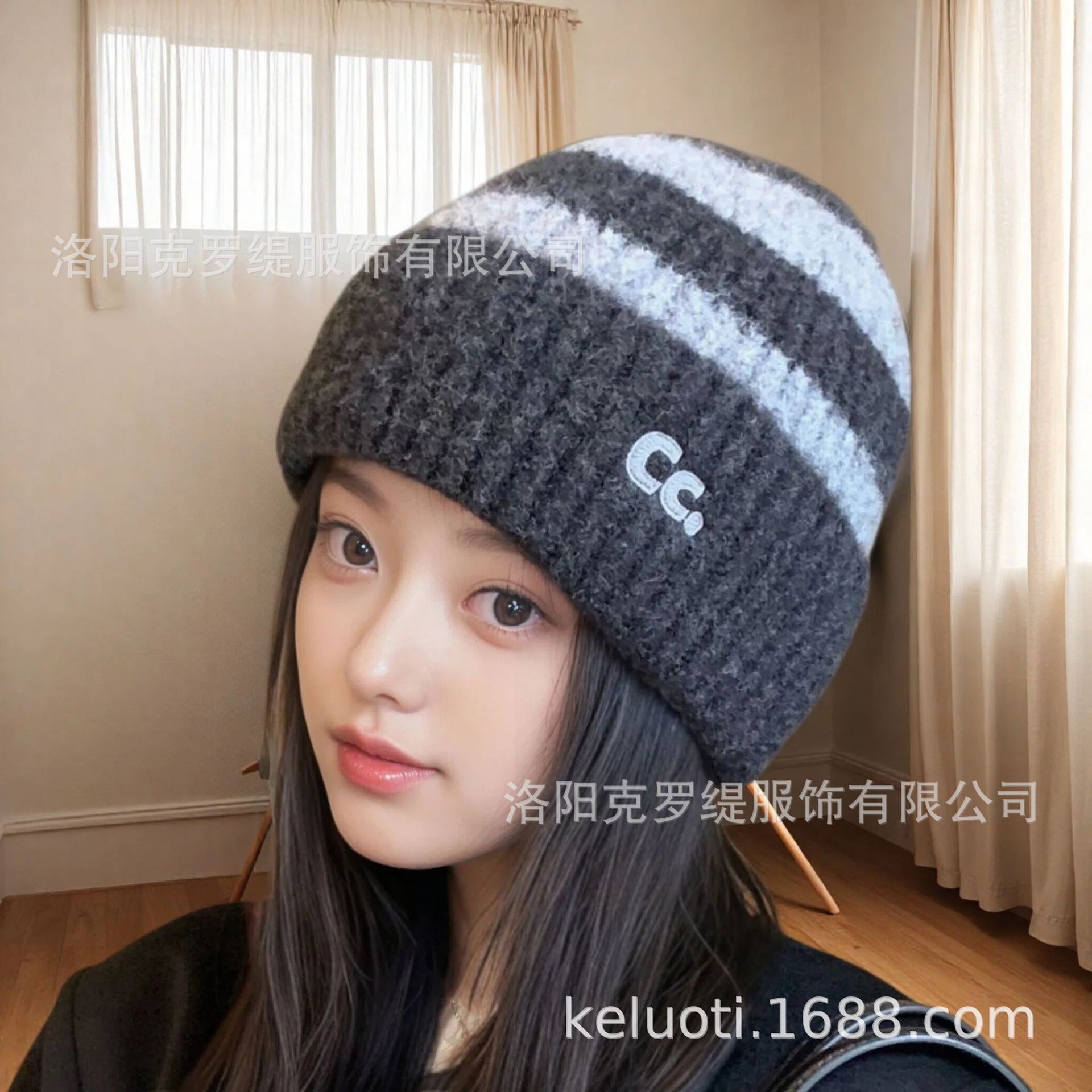 秋冬韩版冷帽情侣款显脸小百搭保暖护耳帽子小众字母条纹针织帽潮