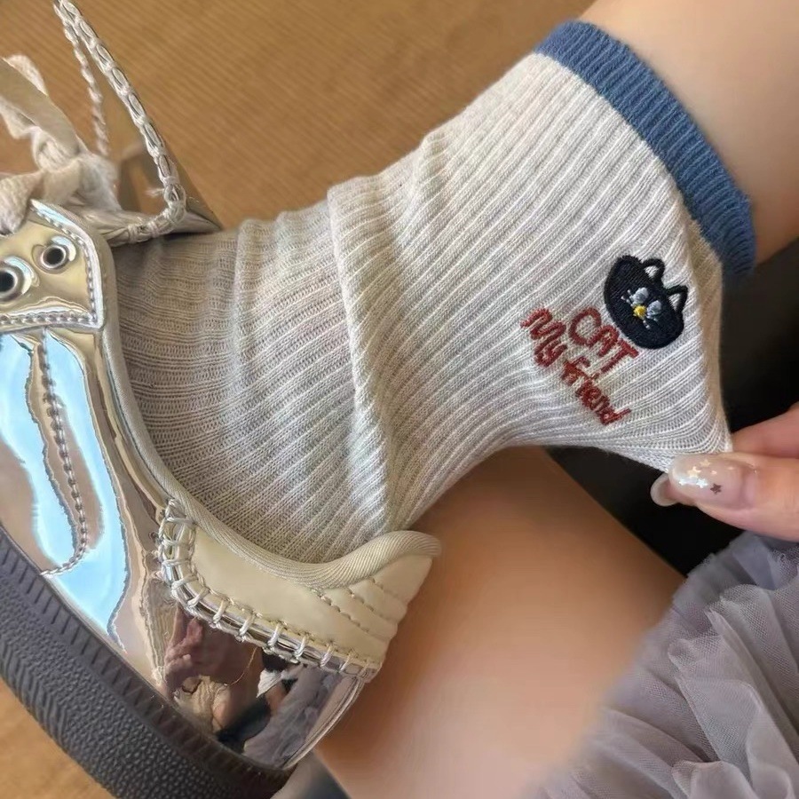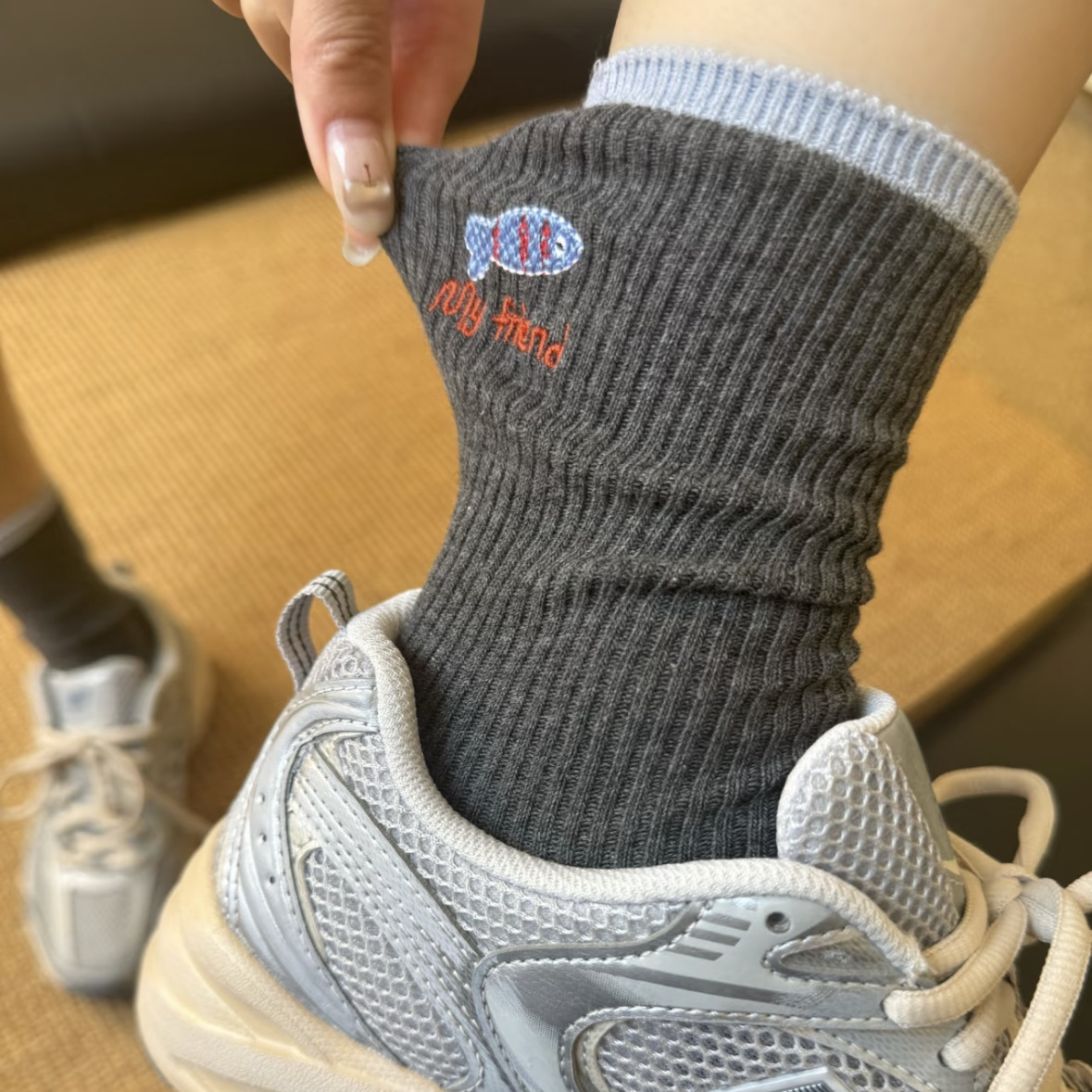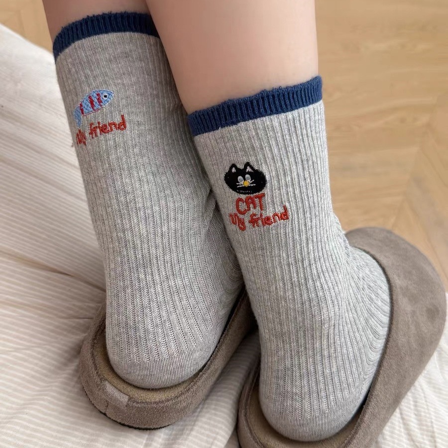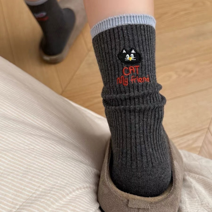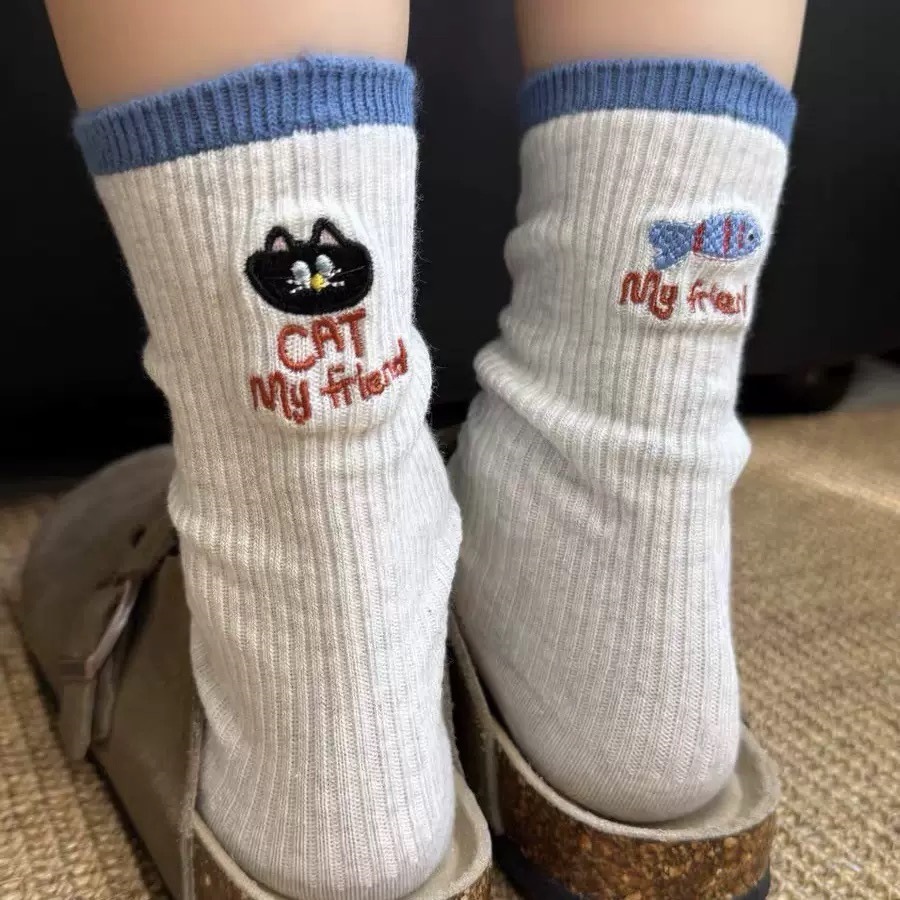 秋冬新款袜子女个性潮袜AB版刺绣小猫小鱼字母中筒堆堆袜棉袜批发