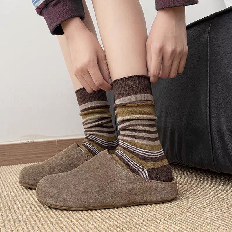 秋冬咖色系经典复古条纹ins日系撞色百搭文艺小众中筒袜拼色设计