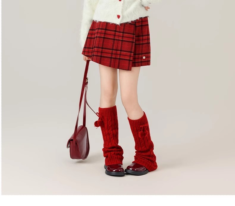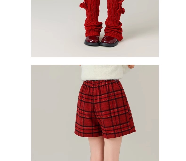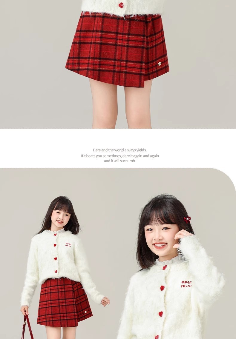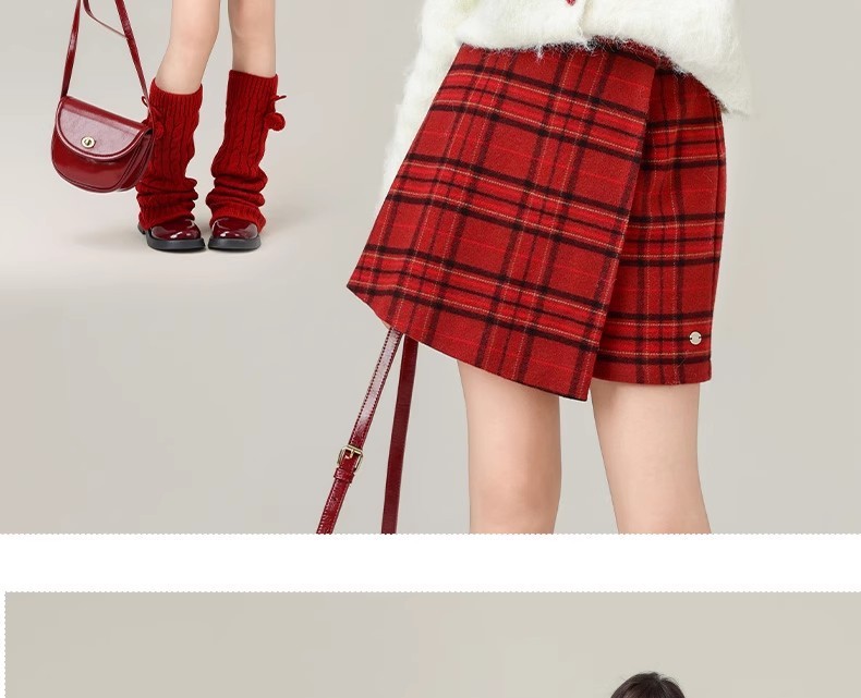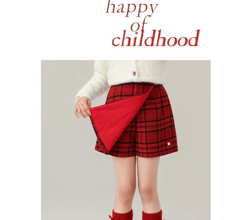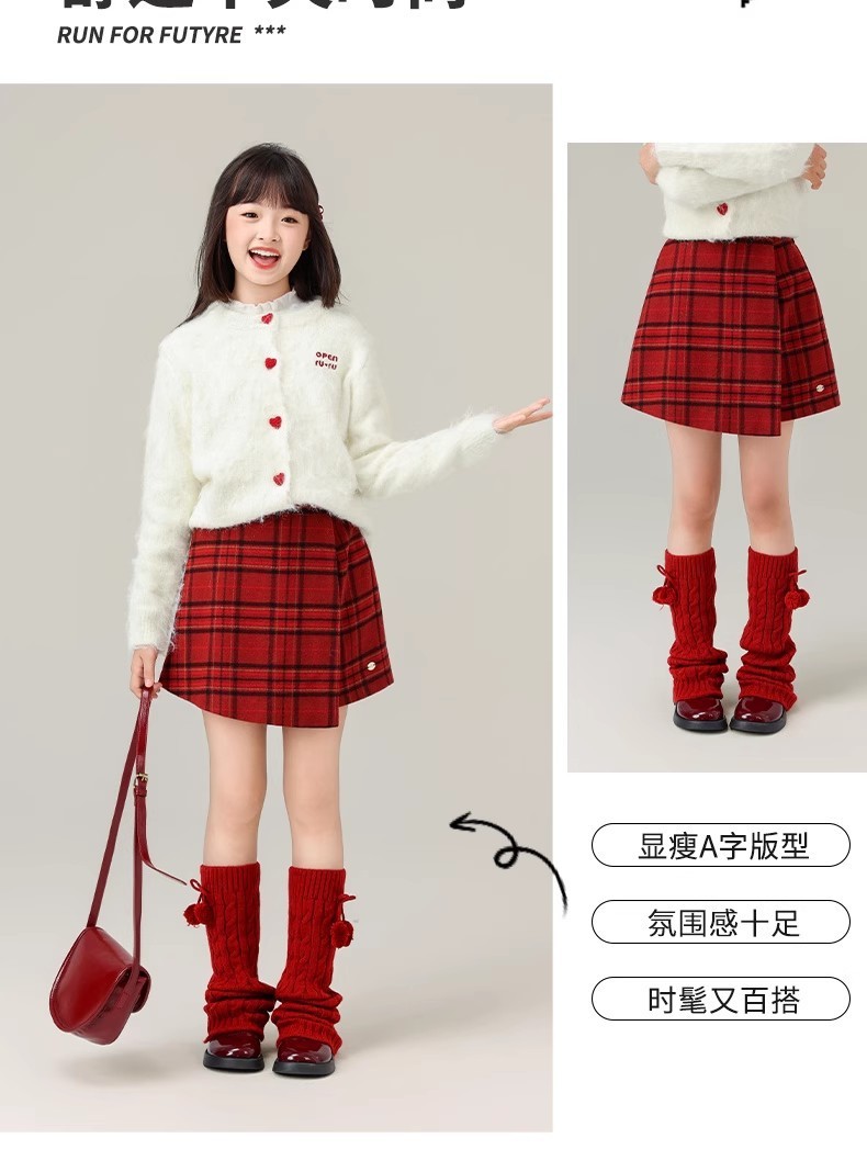 女の子用赤い格子柄ウールスカート 2025秋冬新作 ガールズカレッジスタイルプリーツスカート ヒップスカート ショートスカート