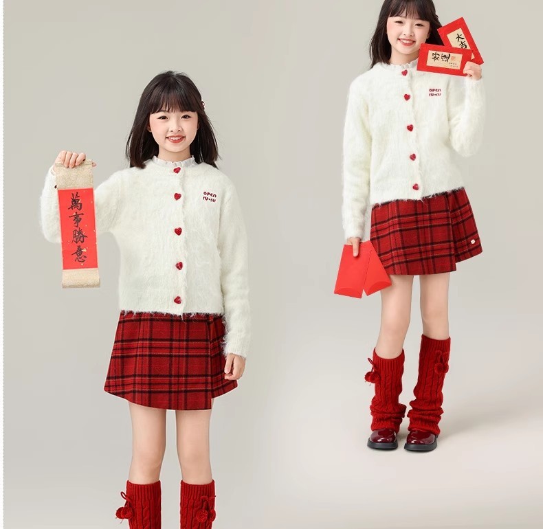 女童过年半身裙秋冬季儿童年服红色格子短裙大童女孩新年直筒裙子