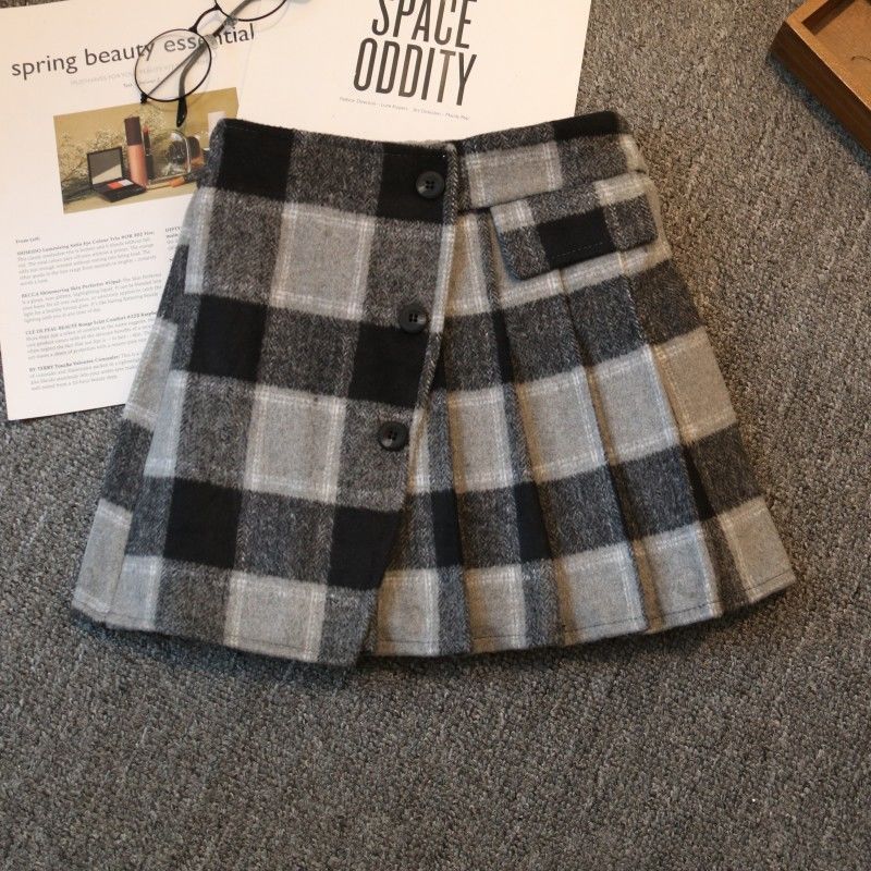 子供用秋冬おしゃれハイウエストスカート2025女の子黒色ウールチェック柄ヒップスカート女の子用裏起毛ショートスカート