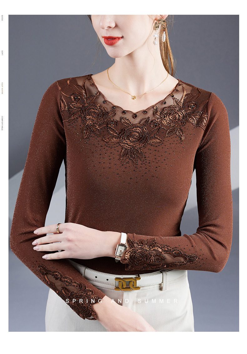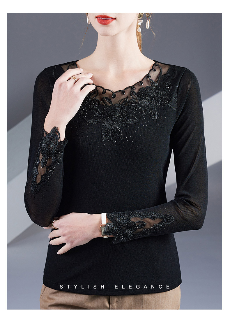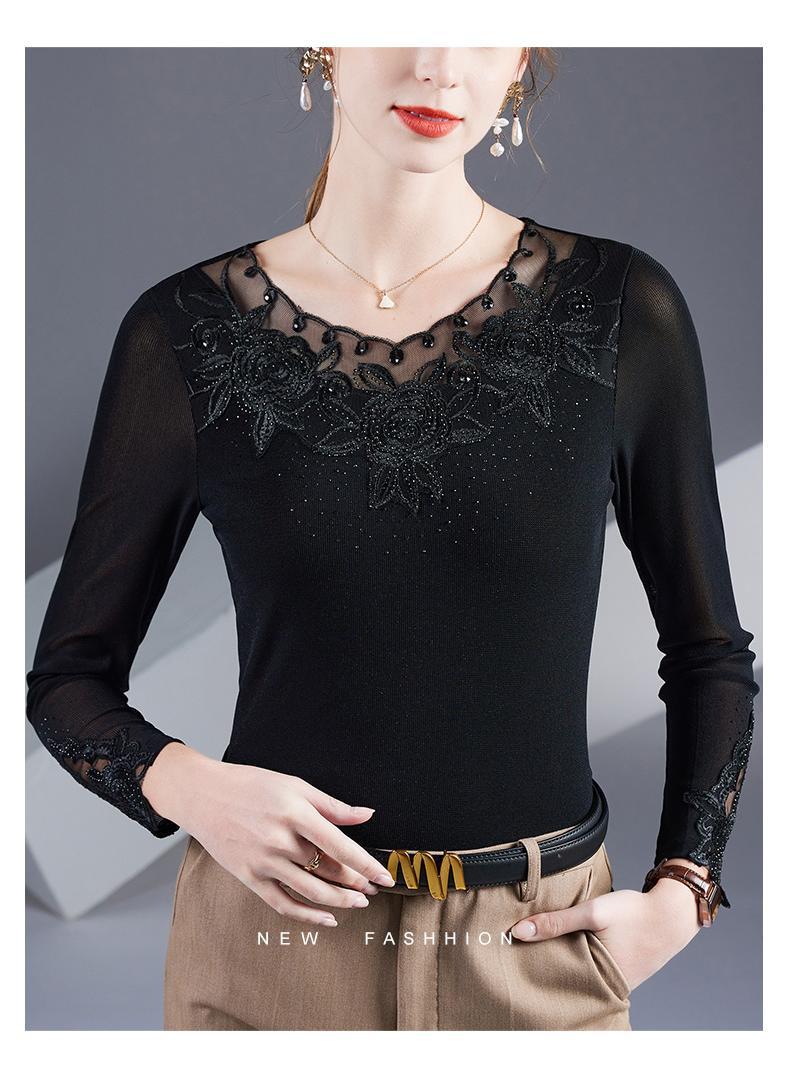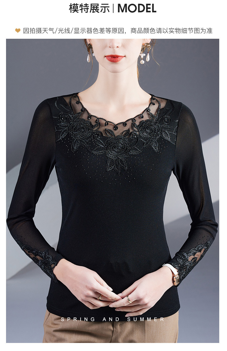 2025秋季绣花镶钻银丝网纱女上衣洋气纱衣百搭长袖打底衫上衣