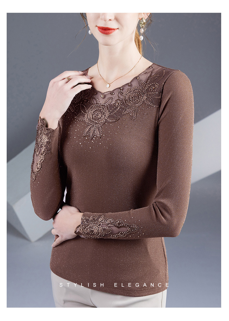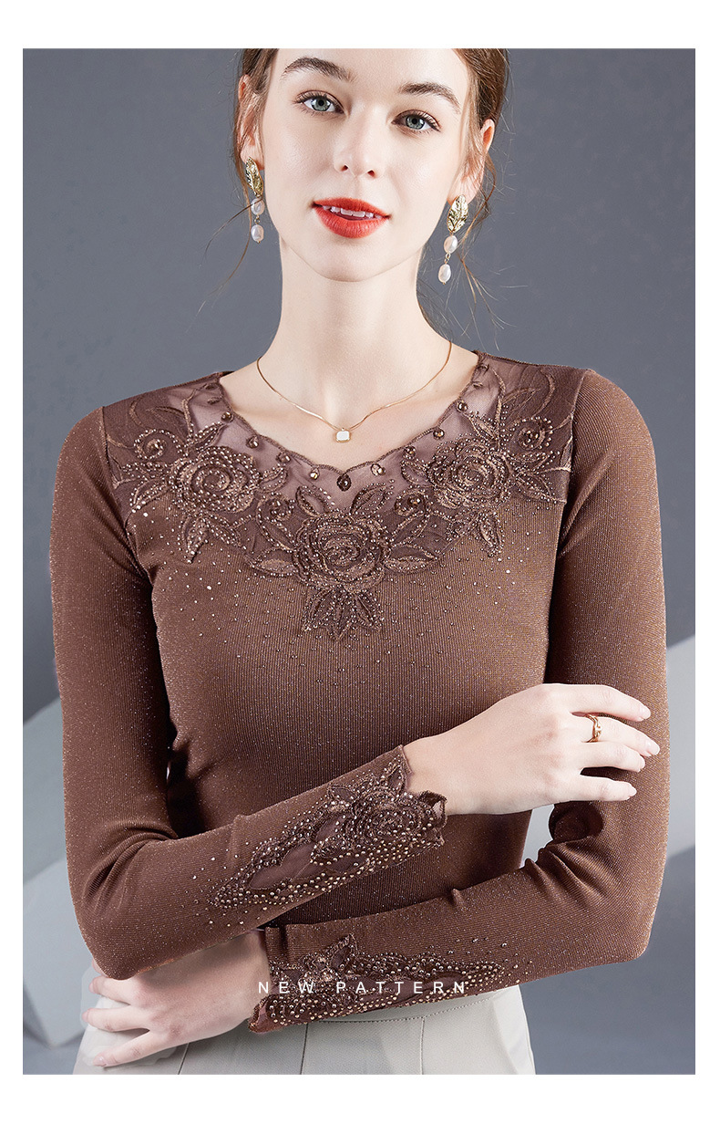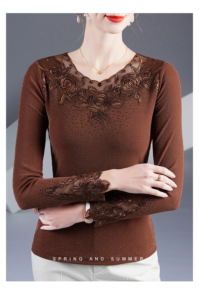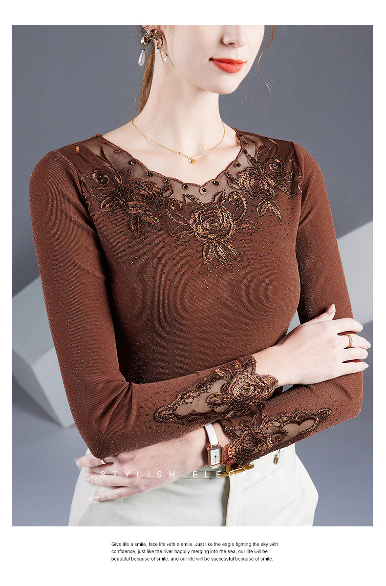 2025秋季绣花镶钻银丝网纱女上衣洋气纱衣百搭长袖打底衫上衣