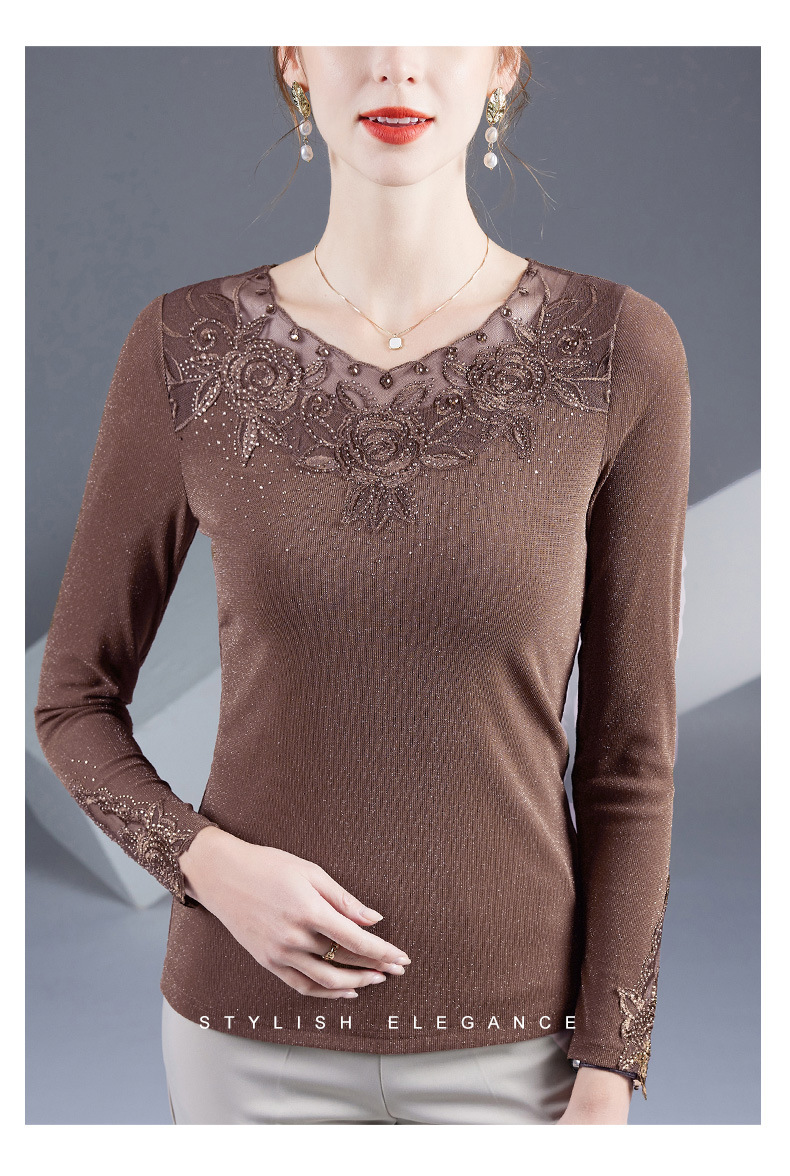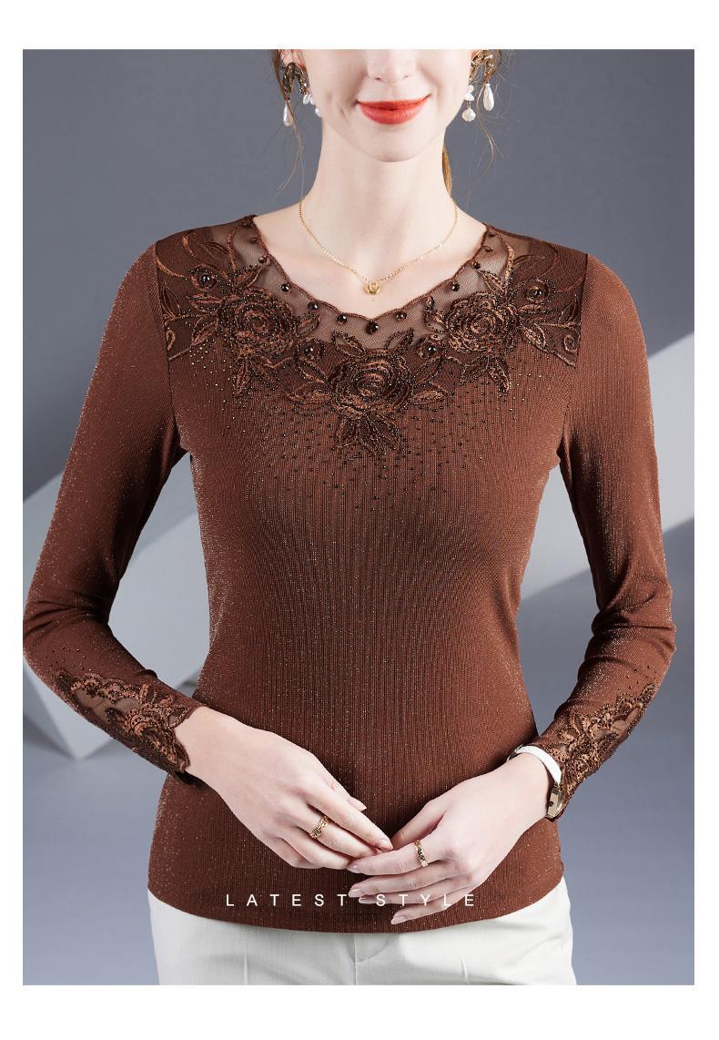 2025 秋のファッション中高年女性のシルバーメッシュ Tシャツスリム韓国風刺繍長袖ボトムシャツトップ