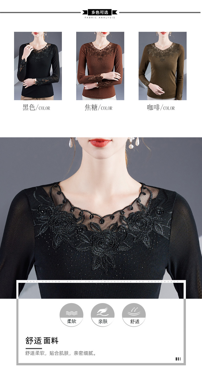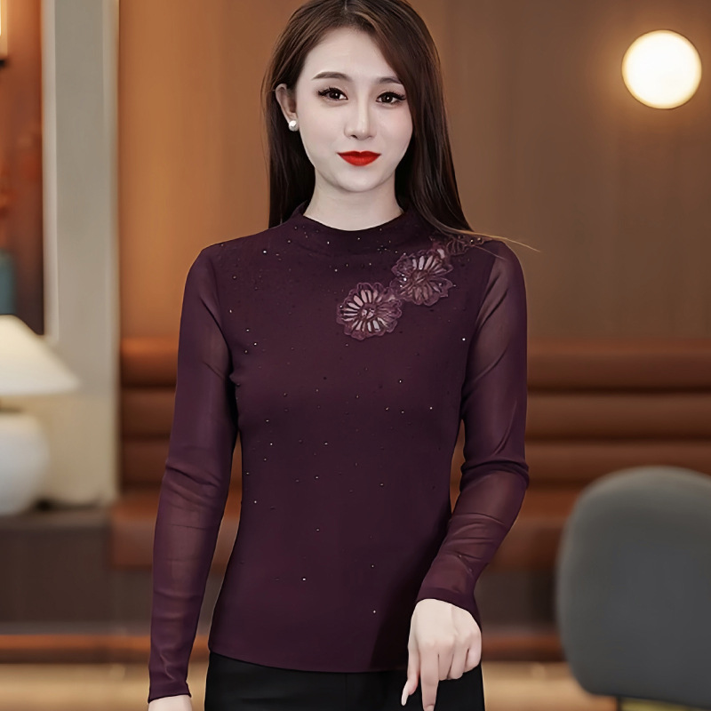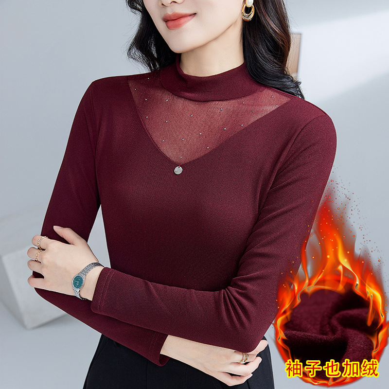 冬季内搭保暖小衫半高领网纱烫钻绣花长袖t恤女弹力加绒打底衫女