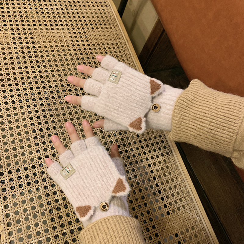 冬季加厚半指翻盖手套女可爱冬天骑行保暖针织学生可写字打字手套
