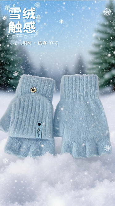 韩版针织毛绒手套冬季保暖防寒学生半指翻盖手套办公打字户外骑行