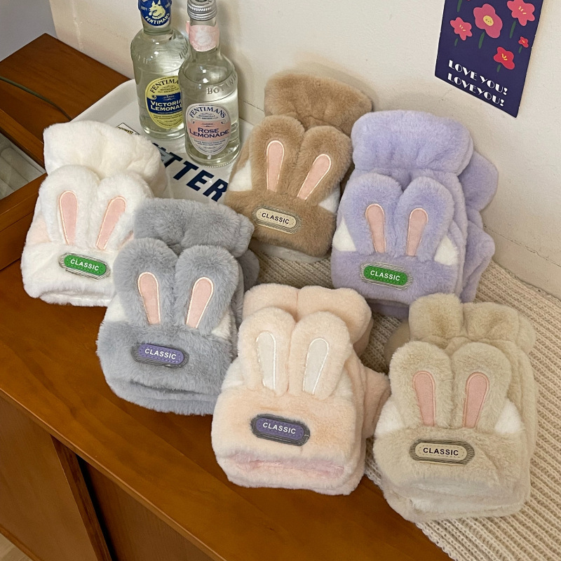兔耳朵毛绒手套卡通保暖女秋冬可爱加绒加厚翻盖露指写字学生兔子