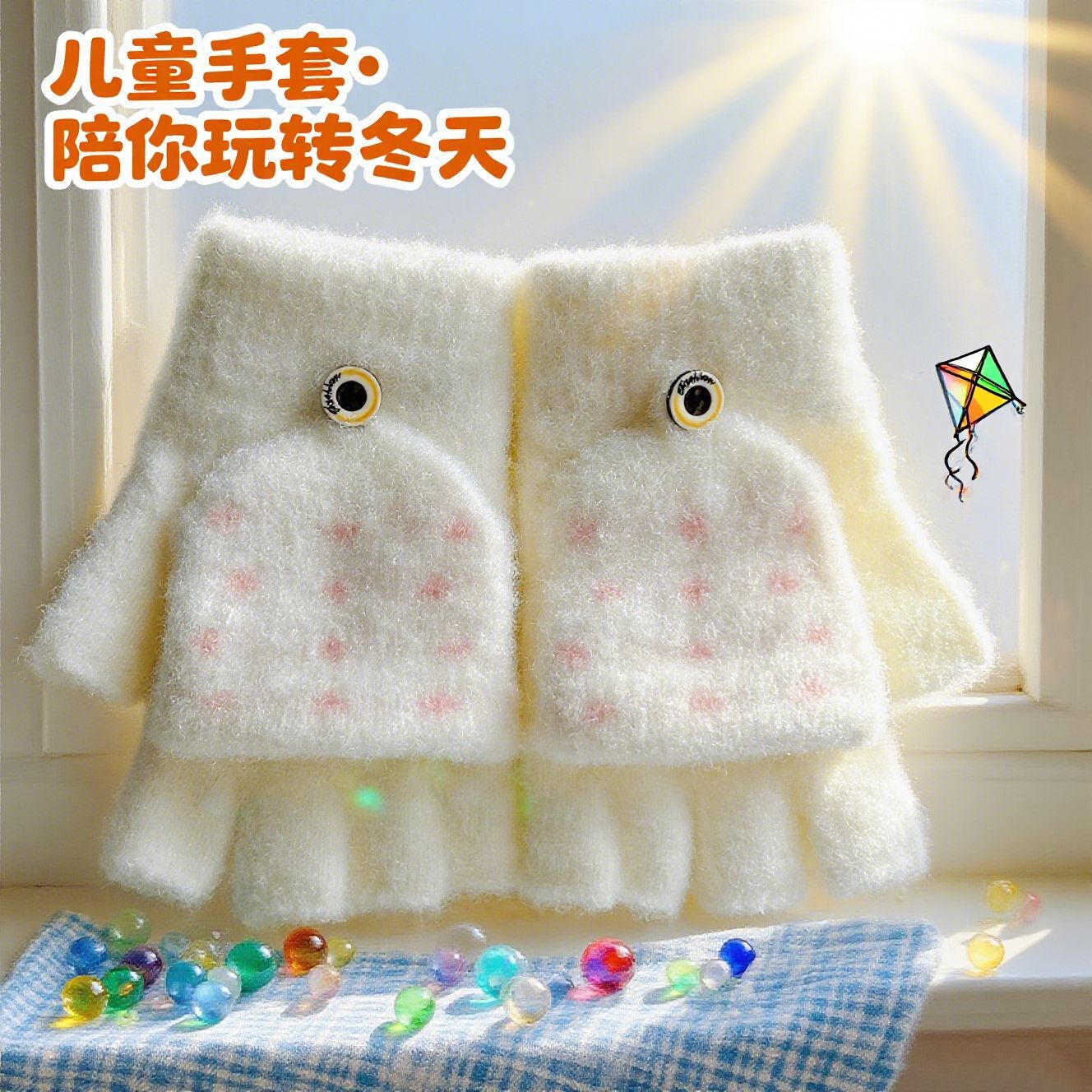 严选手套女冬学生儿童半指翻盖卡通毛绒秋冬季加绒加厚保暖手套批