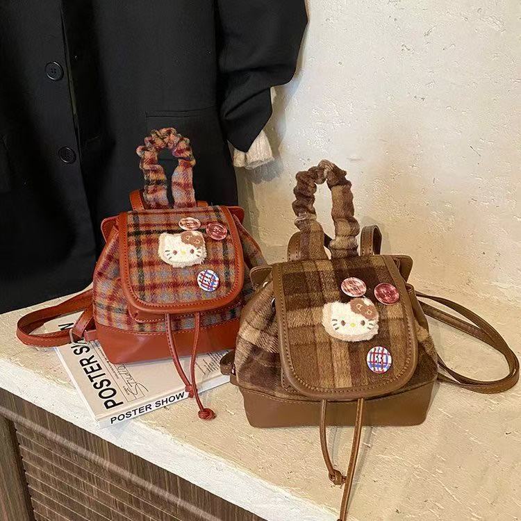 韩版卡通可爱凯蒂猫双肩包包女小众设计复古百搭格纹通勤手提背包