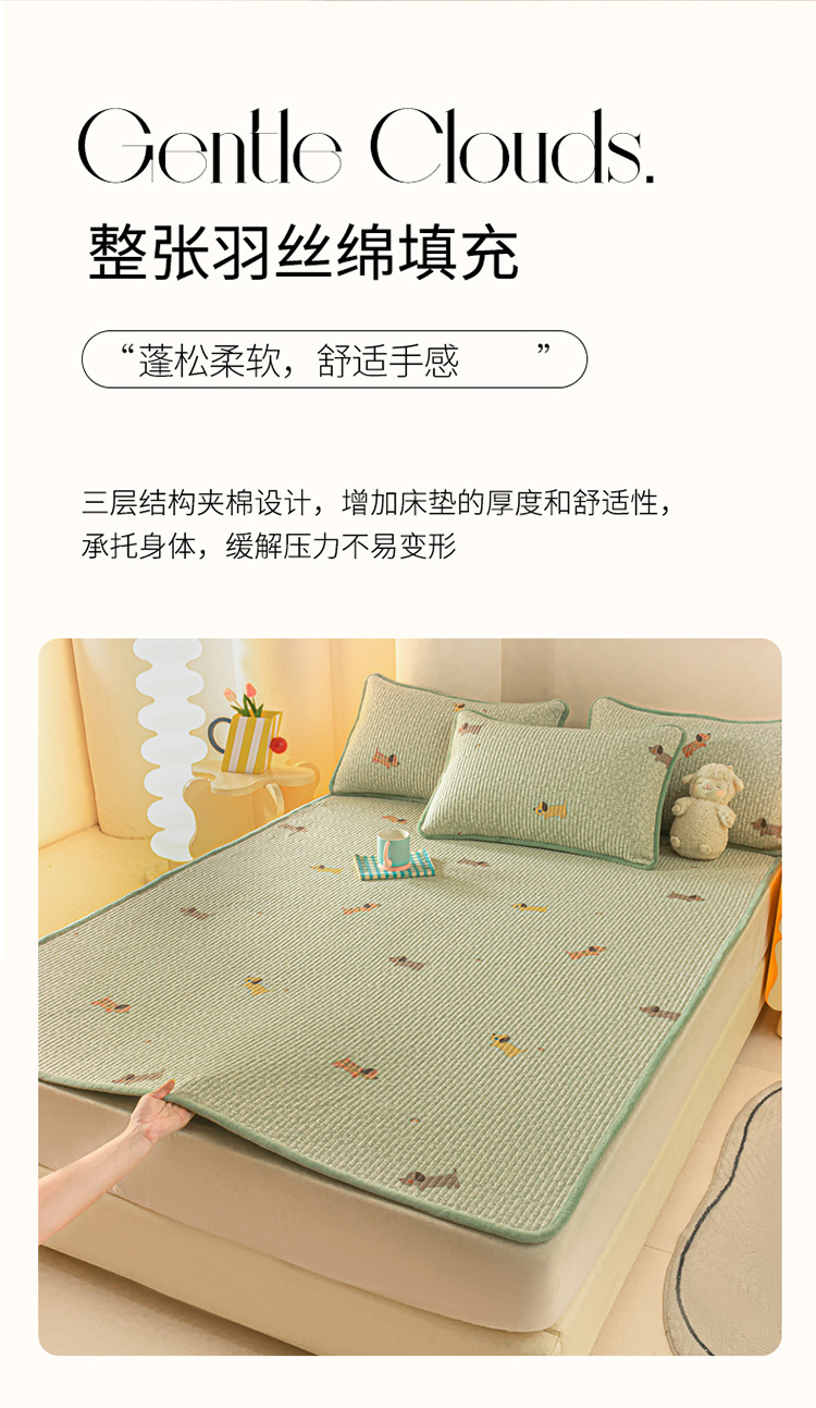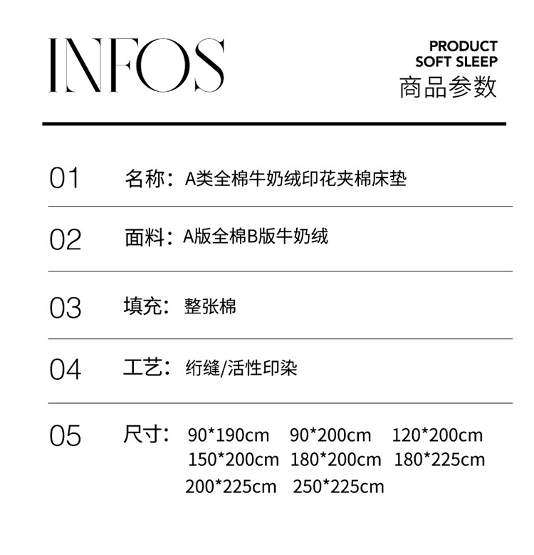 尺寸规格 90x200cm单床垫,120x200cm单床垫,150x200cm单床垫,180x200cm单床垫,180x225cm单床盖,200x225cm单床盖,225x250cm单床盖,枕套一对,枕套一支