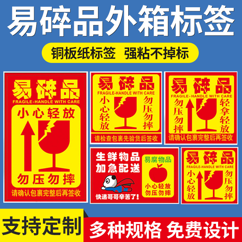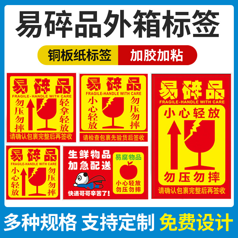 在庫ありの壊れやすいラベルステッカー、物流外箱に注意してください、警告ステッカー、粘着ステッカー、壊れやすいステッカー、落下防止