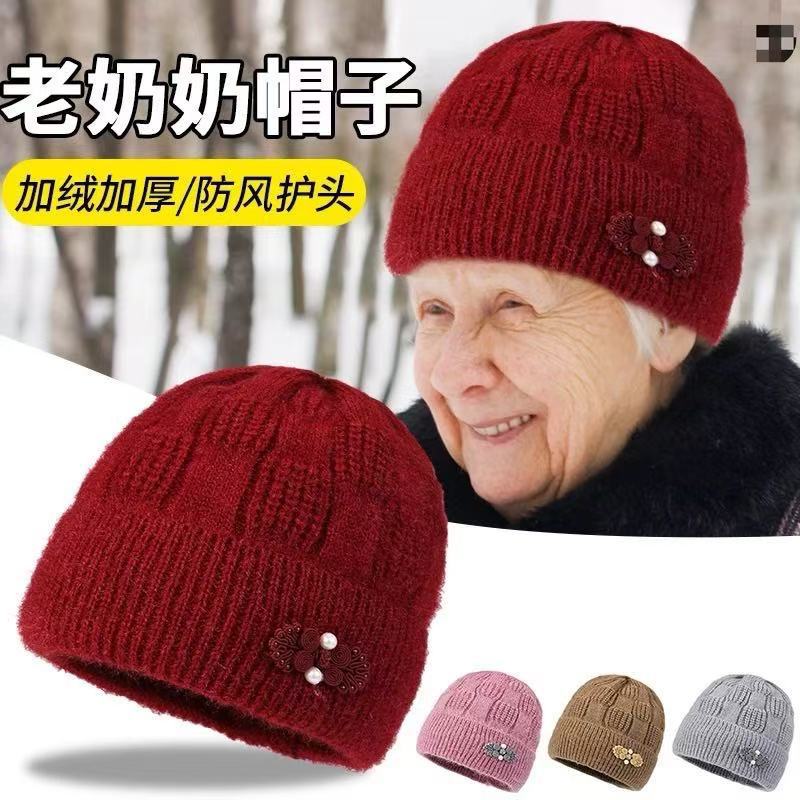 冬季时尚老人加绒奶奶加厚保暖女士针织毛线帽妈妈中老年帽子