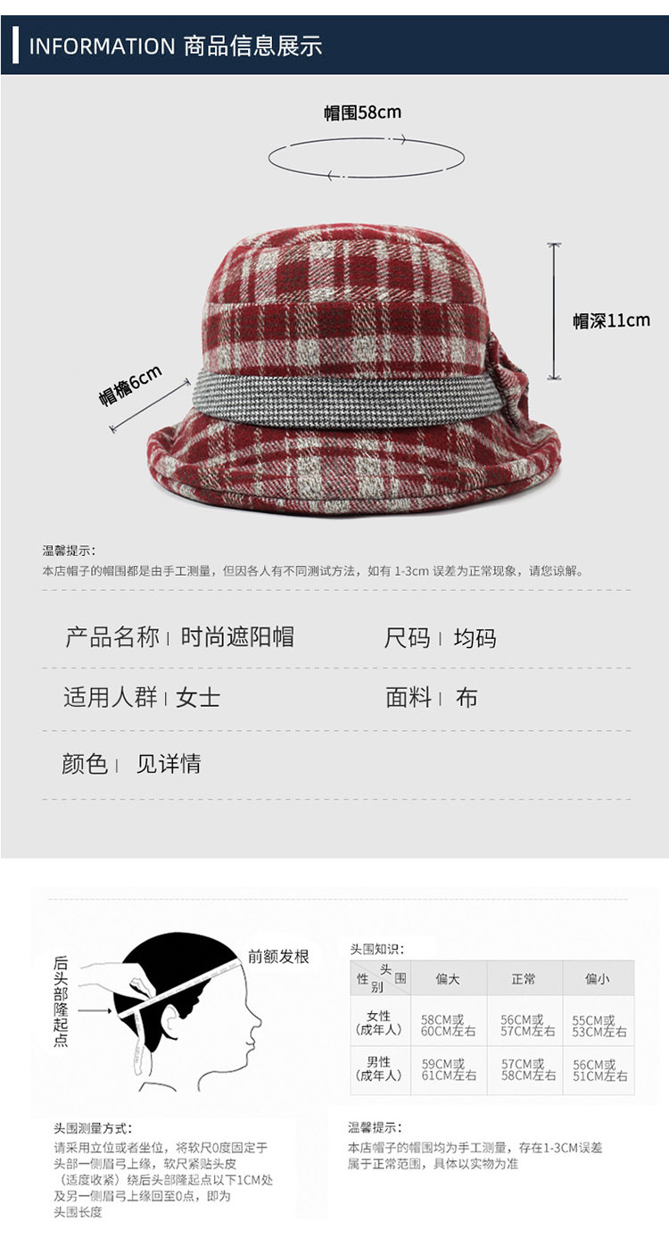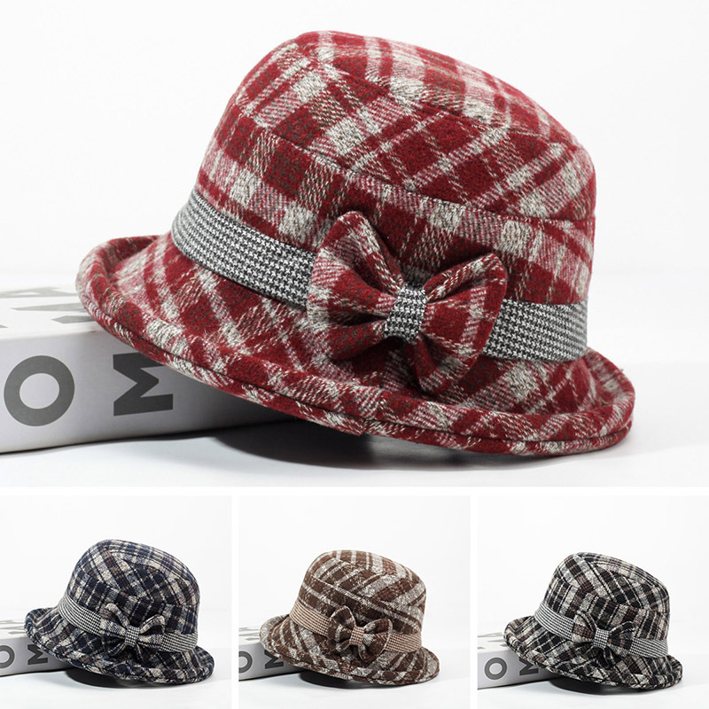 中老年保暖时尚休闲格纹盆帽秋冬季蝴蝶结渔夫帽帽子妈妈奶奶棉帽