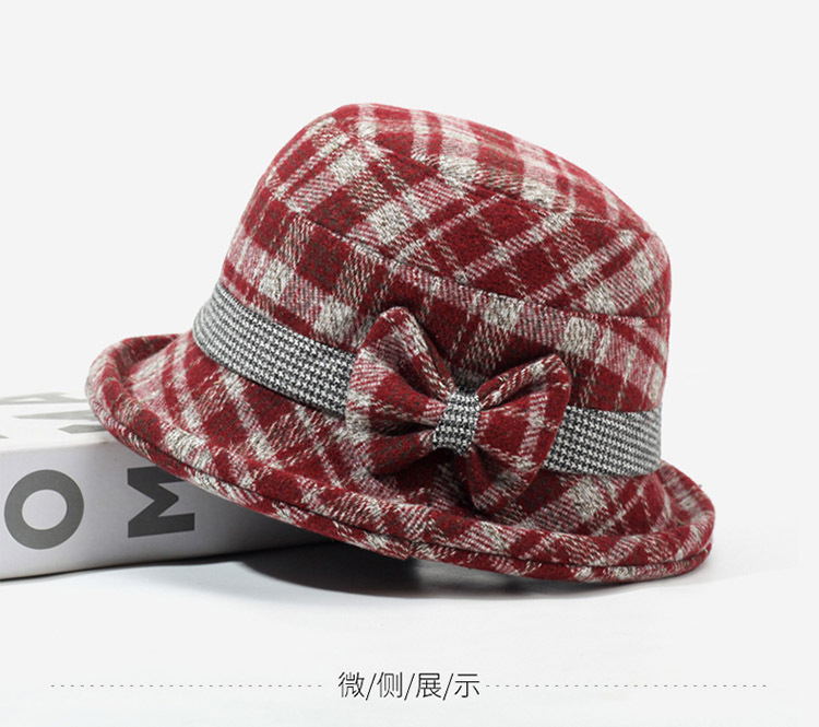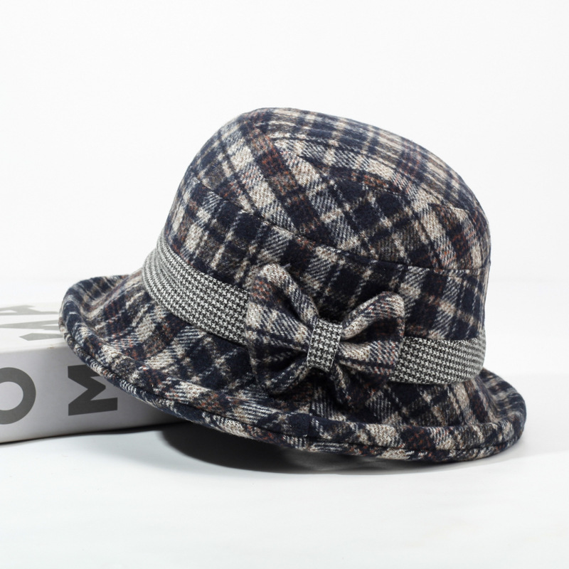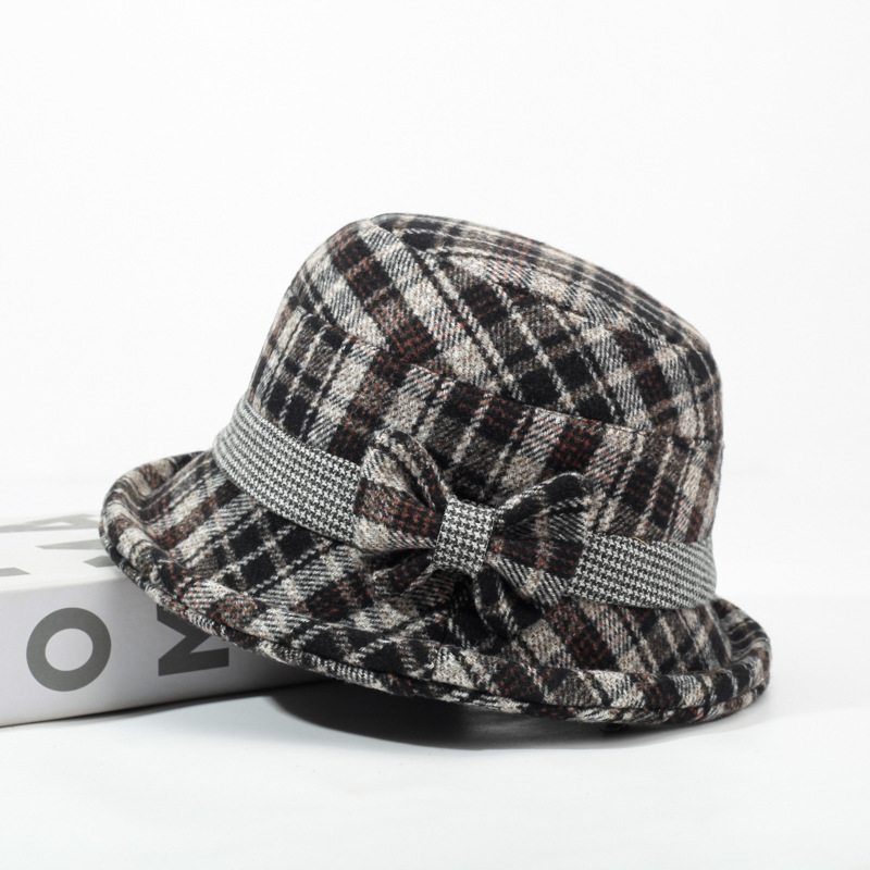 帽子の女性の格子の毛は保温の漁師の帽子の秋冬のドームのファッションの蝶結びの盆の帽子の韓国版のつばの小さい帽子です。