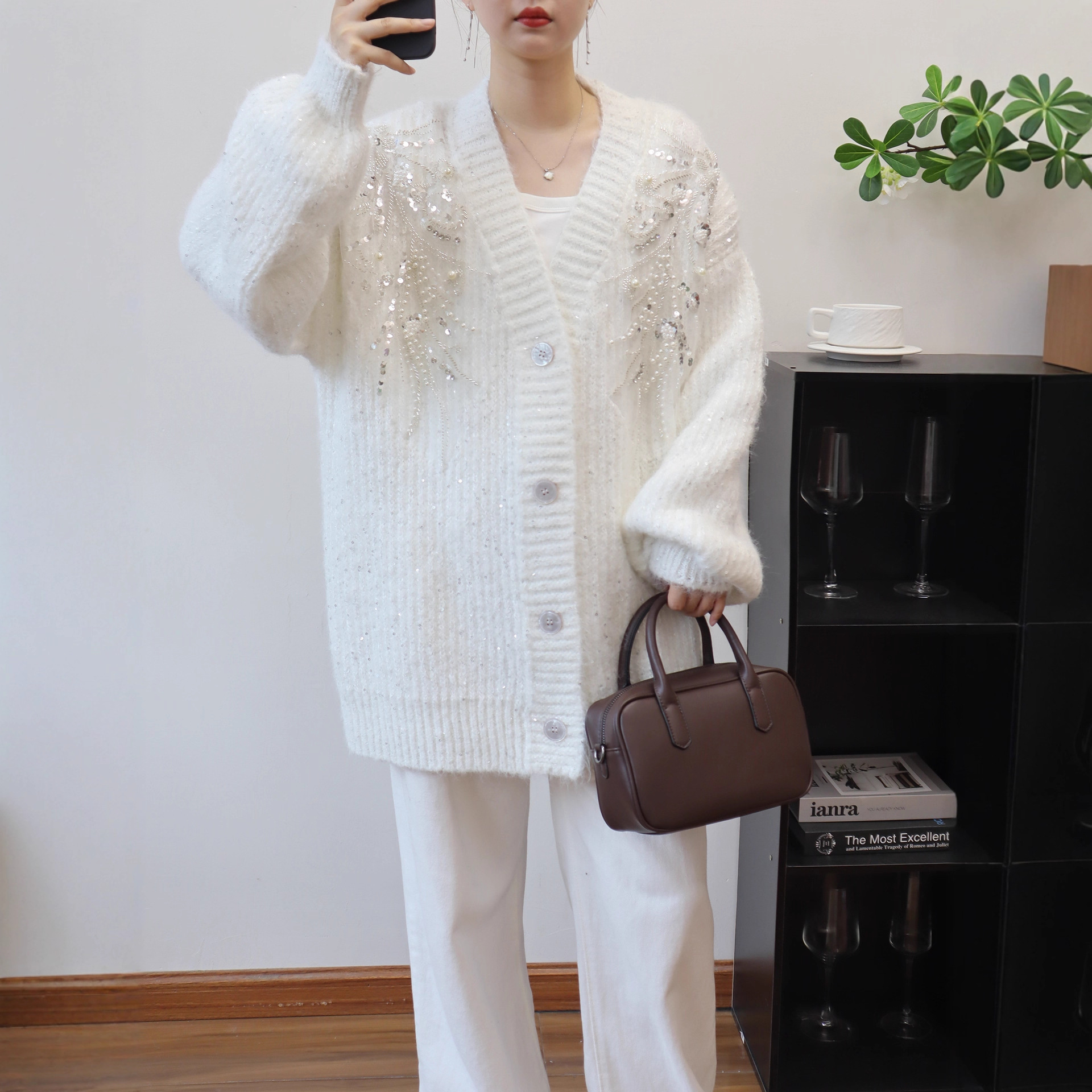 2025秋冬新款中长款针织开衫韩版宽松亮片钉珠设计感毛衣外套女潮