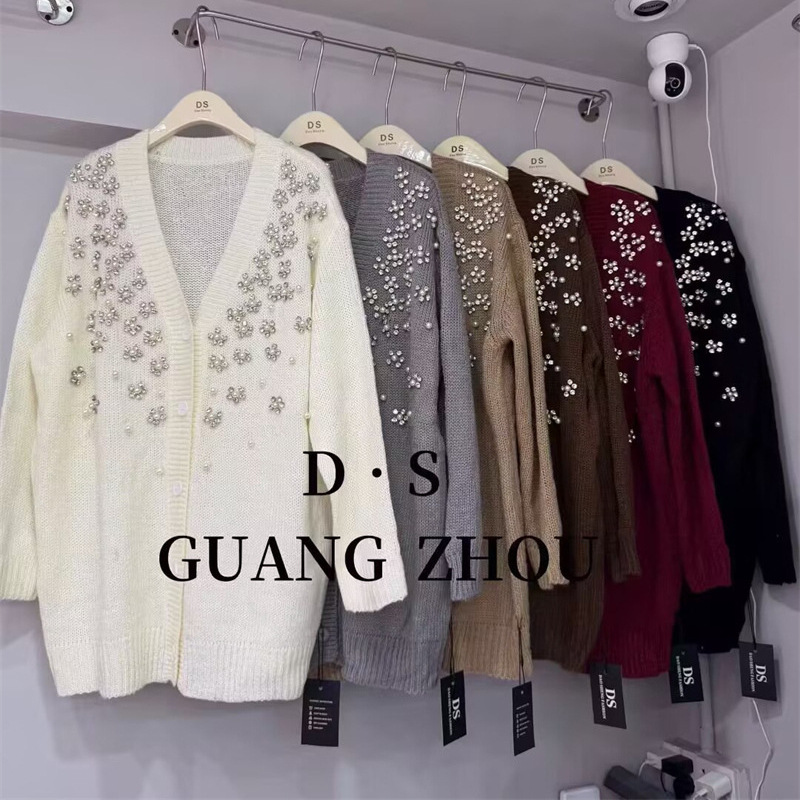 欧货重工亮片钉珠V领毛衣外套女秋冬新款慵懒风宽松长款针织开衫