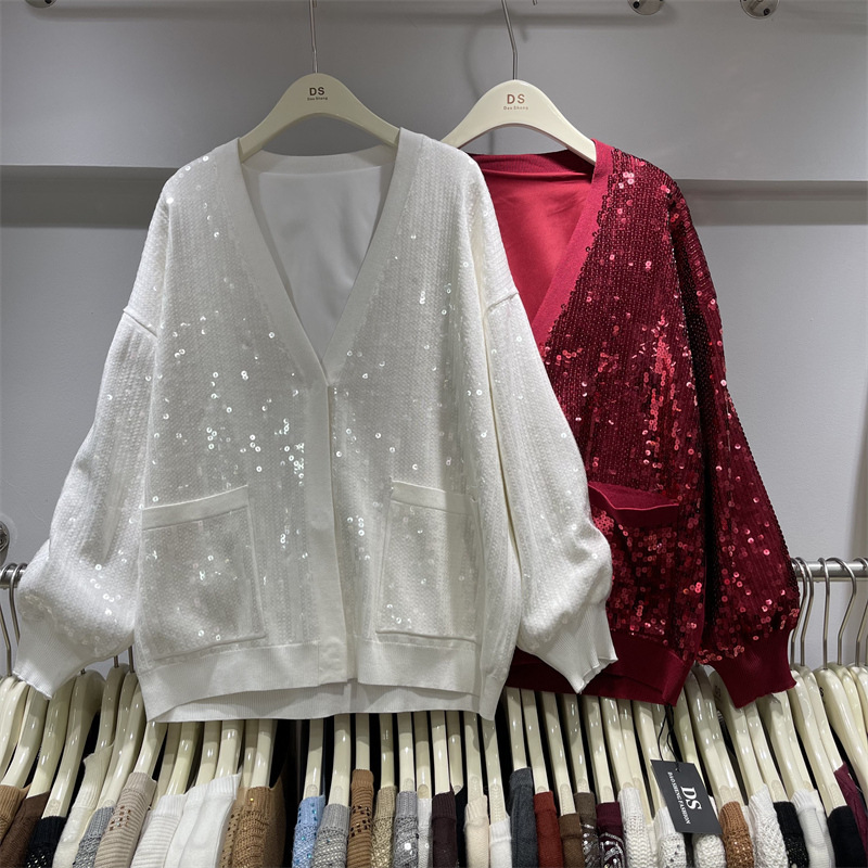 欧美跨境重工亮片V领针织开衫女秋冬新款设计感宽松遮肉毛衣外套