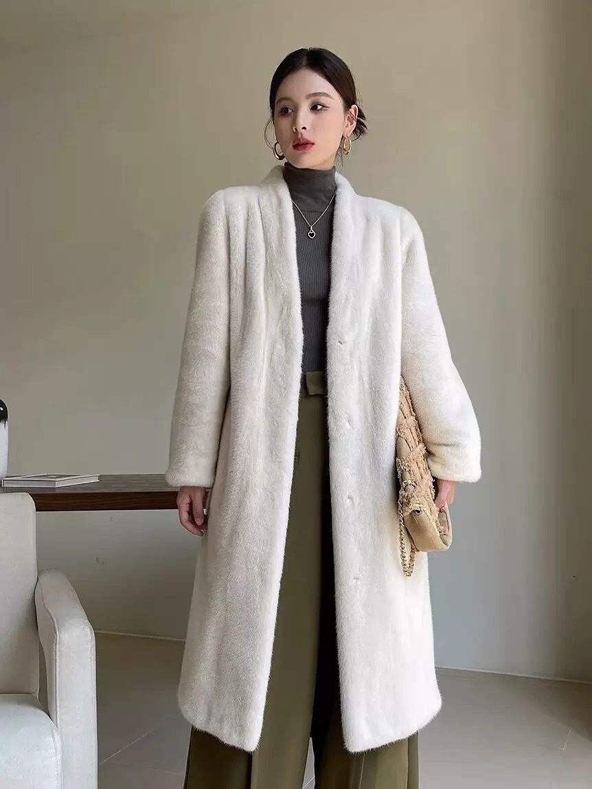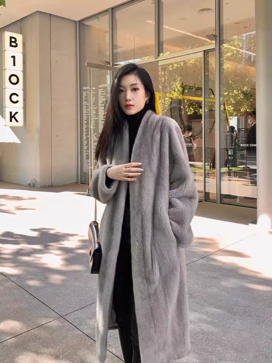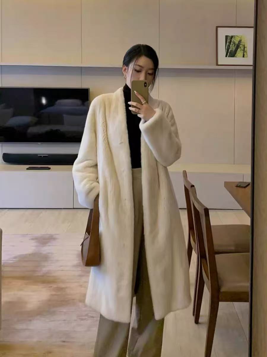 2025冬新款天鹅绒貂皮大衣女整貂环保水貂皮草加长款外套V领