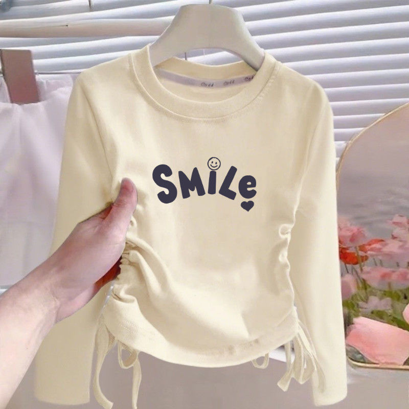 女童打底衫春秋2025新款儿童纯棉抽绳长袖T恤圆领女大童内搭上衣