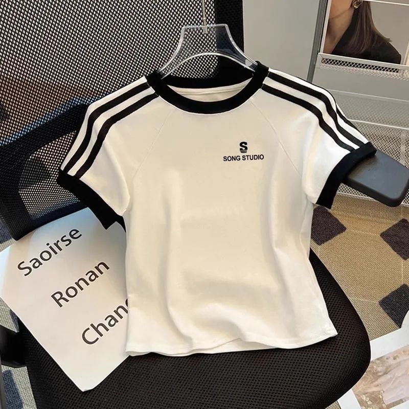 ストライプ右肩半袖Tシャツレディース夏デザインホットガール痩身白Tシャツショートトップ