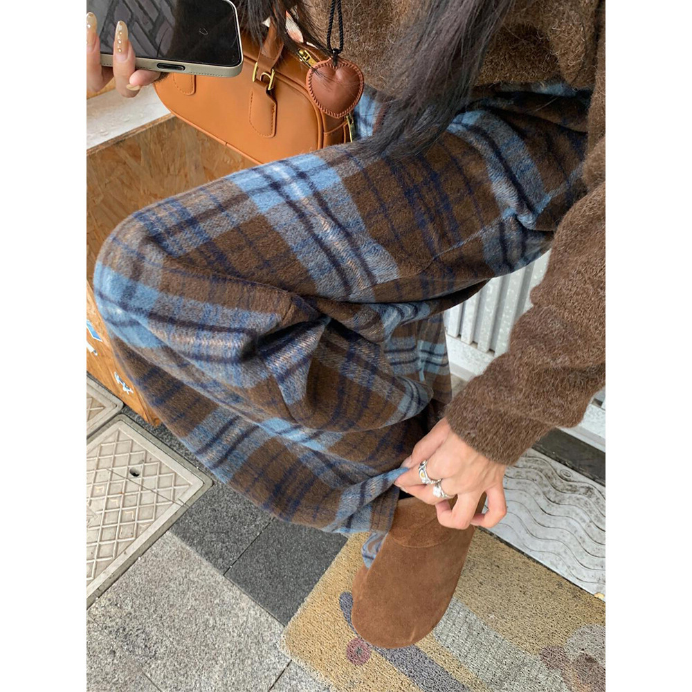 孕妇蓝色毛呢格子托腹裤孕妇秋冬加绒直筒垂感慵懒复古阔腿长裤拖