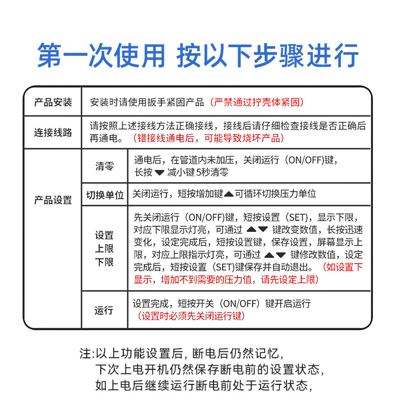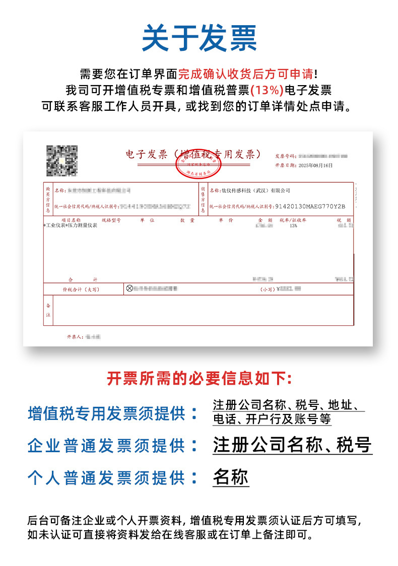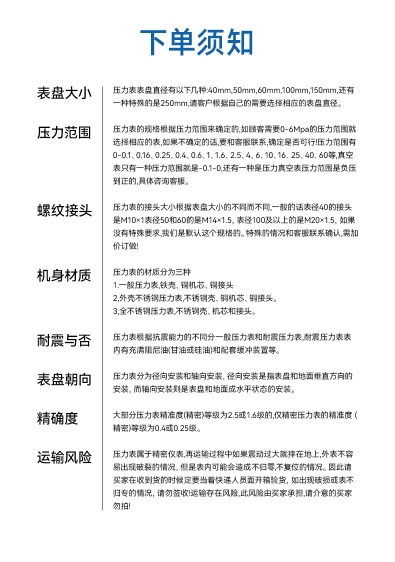 规格 -0.1-1MPa(真空),0.1MPa,0.16MPa,0.25MPa,0.4MPa,0.6MPa,1MPa,1.6MPa,2.5MPa,4MPa,6MPa,10MPa,16MPa,25MPa,0-40MPa升级扩散硅,0-60MPa升级扩散硅