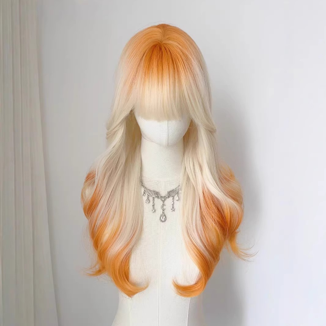 【プラチナフレイムゴールド】女性用ウィッグ ロング巻き毛 前髪グラデーション オレンジ ビッグウェーブ ナチュラル フルヘッドカバー