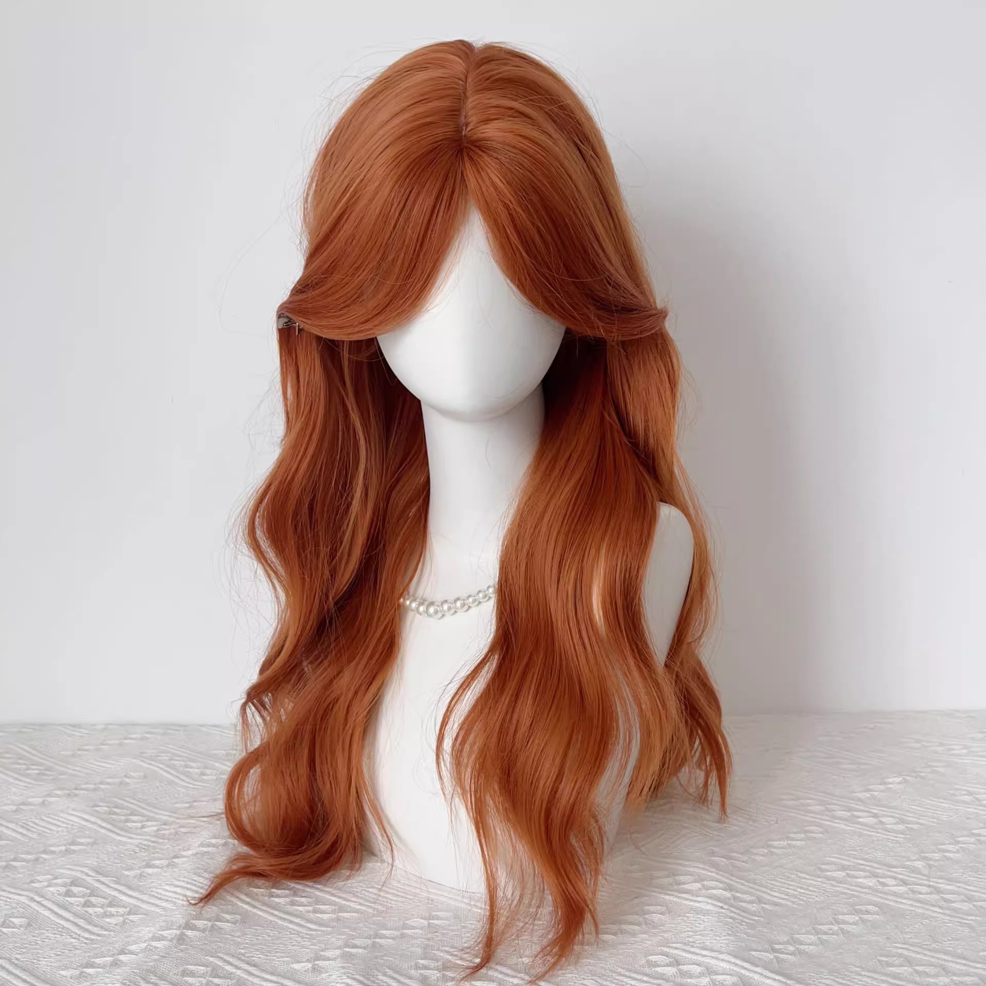 女性用ダーティーオレンジウィッグ、ミディアムパート、ロングカーリーヘア、8の字前髪、ホワイトニングダーティーオレンジ、ナチュラルコス、フルヘッドカバー