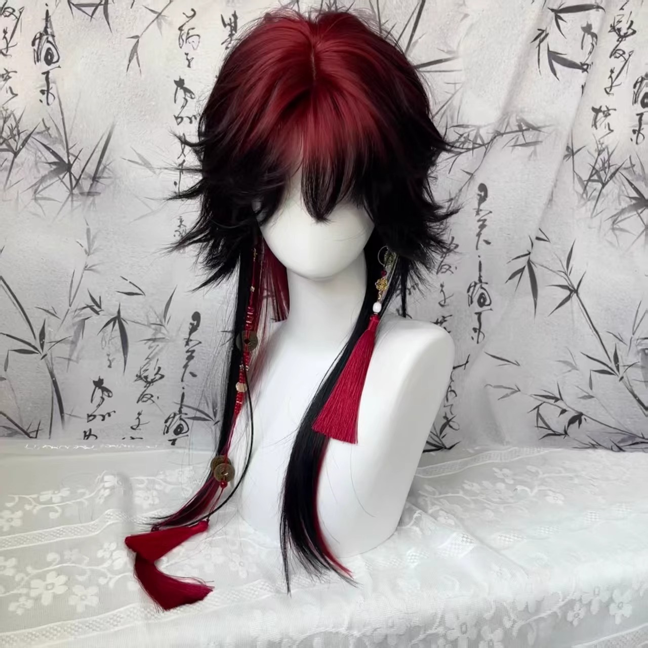 【磁器】cos磁器パパとママウィッグch中国風爆発染め黒赤ハイライトグラデーションクラゲヘッドフルヘッドカバータイプ