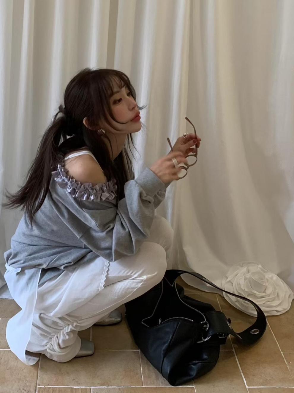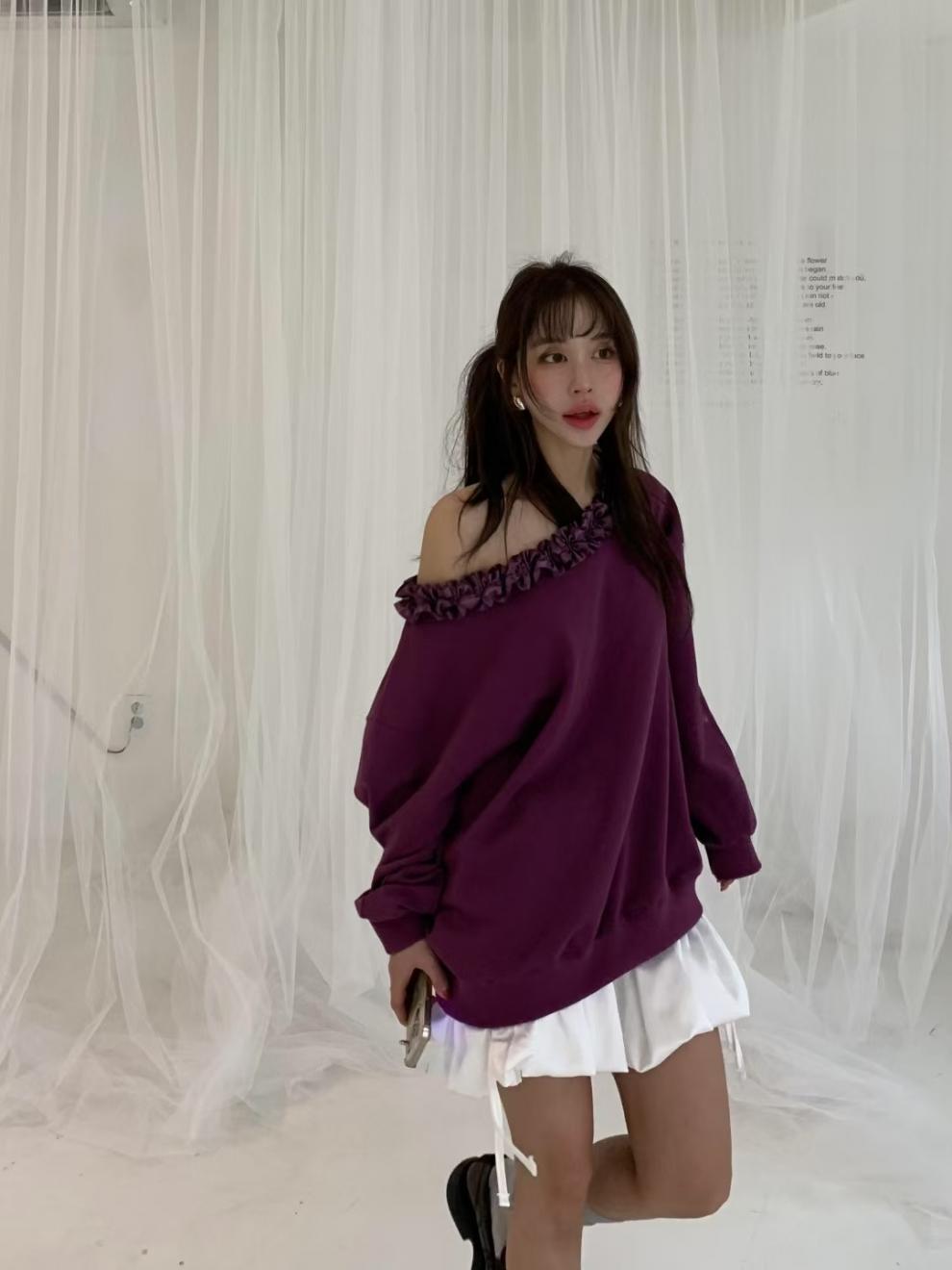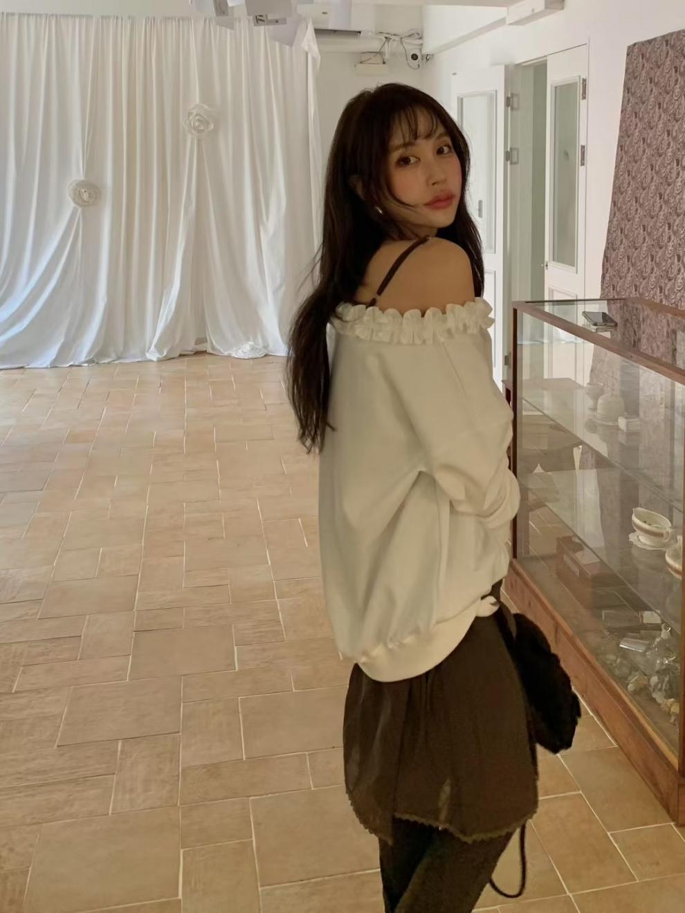 韓国東大門の秋の雰囲気漂う、フリル付き斜め肩出しゆったりデザインの長袖スウェットシャツ(レディース)