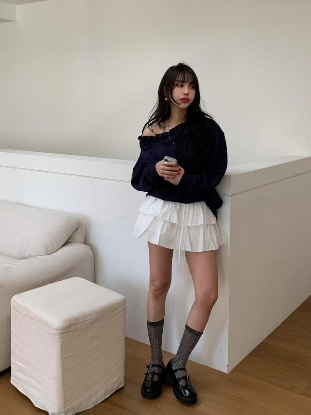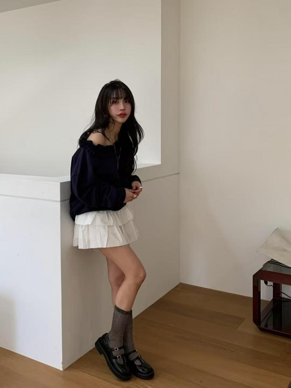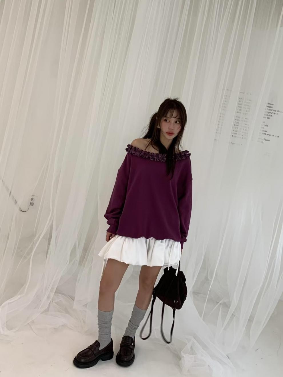 韓国東大門の秋の雰囲気漂う、フリル付き斜め肩出しゆったりデザインの長袖スウェットシャツ(レディース)