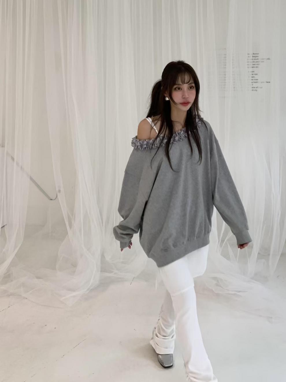 RHGD实拍实价 新品灰色花边一字领可斜肩两穿灰色宽松卫衣