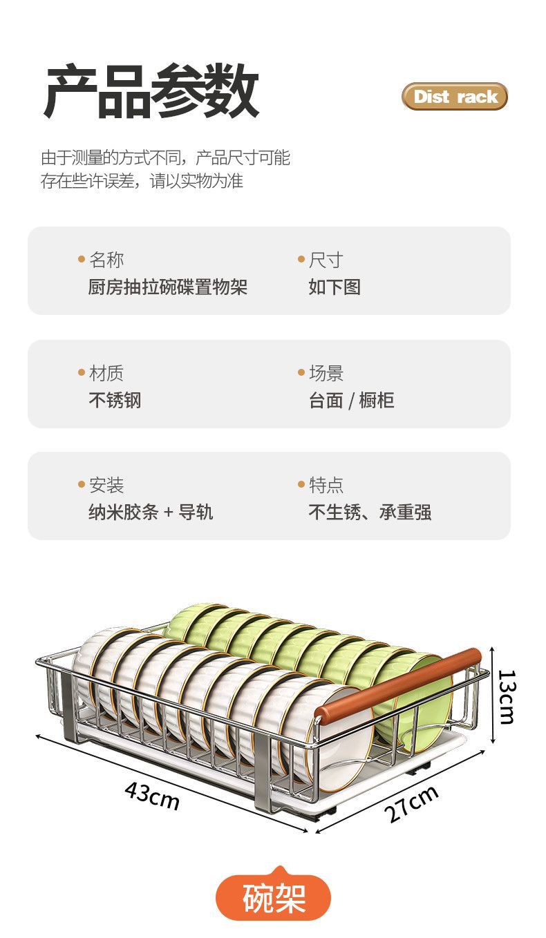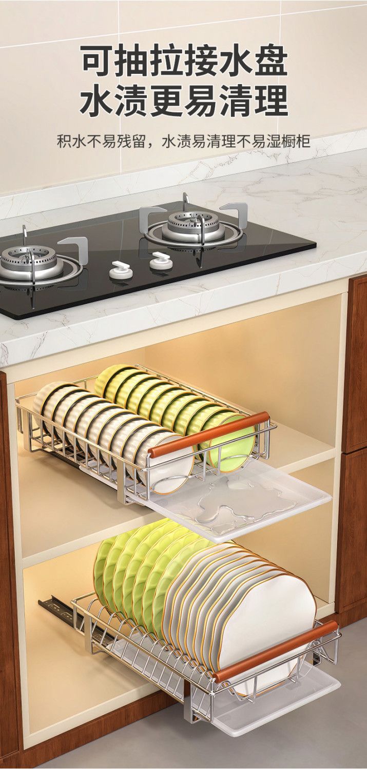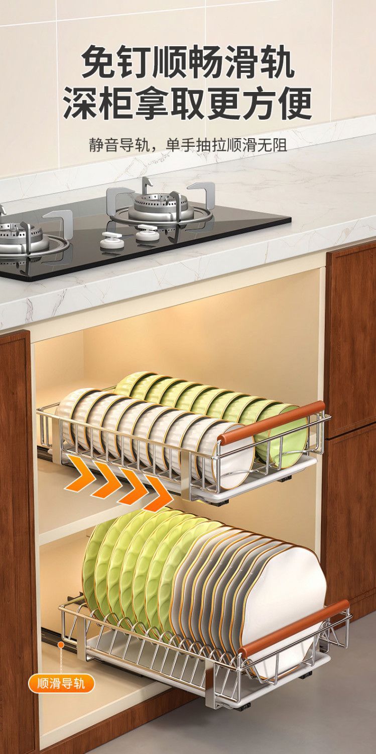 不锈钢厨房碗盘架抽拉碗碟收纳架下橱柜拉篮抽屉式盘子沥水置物架