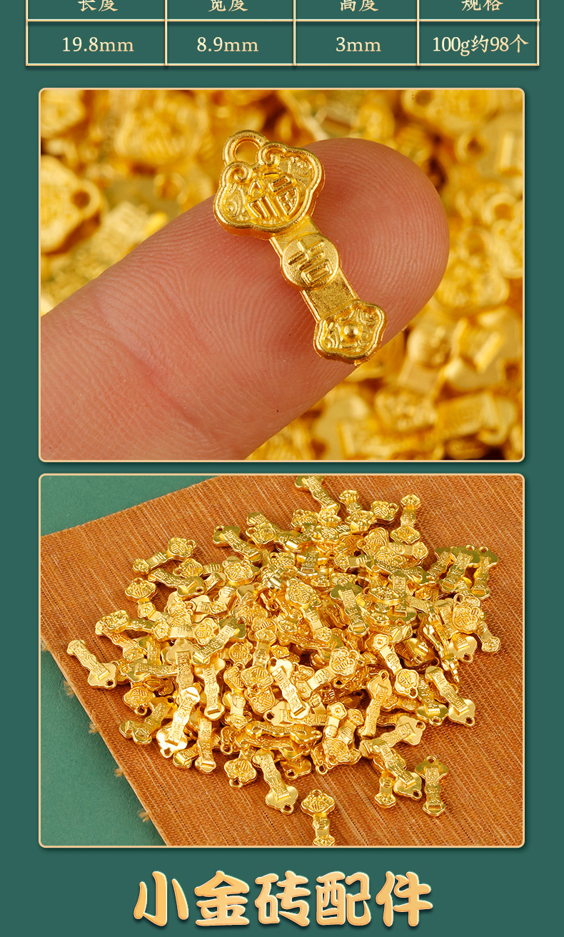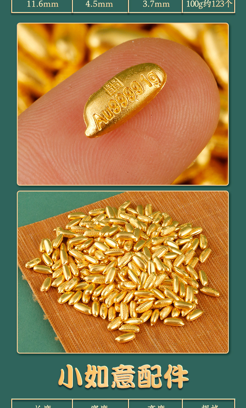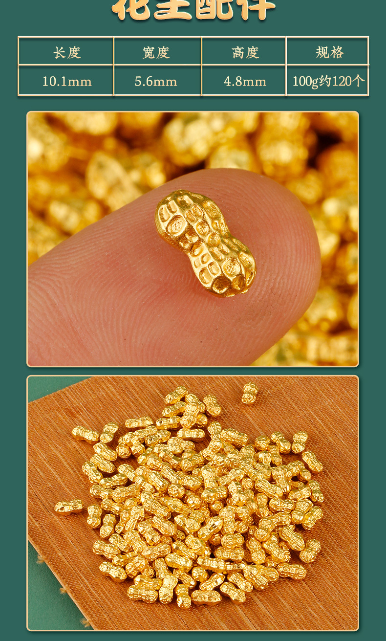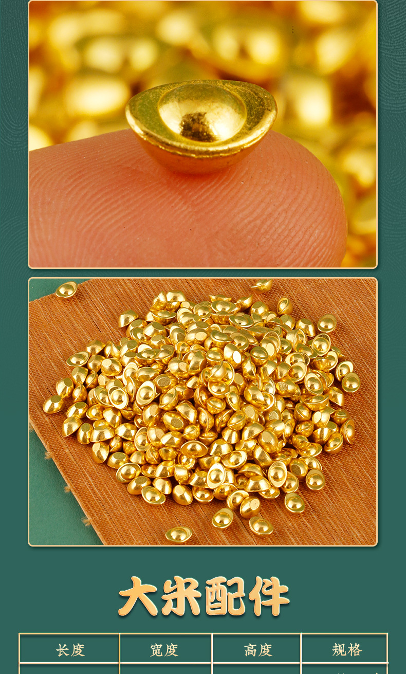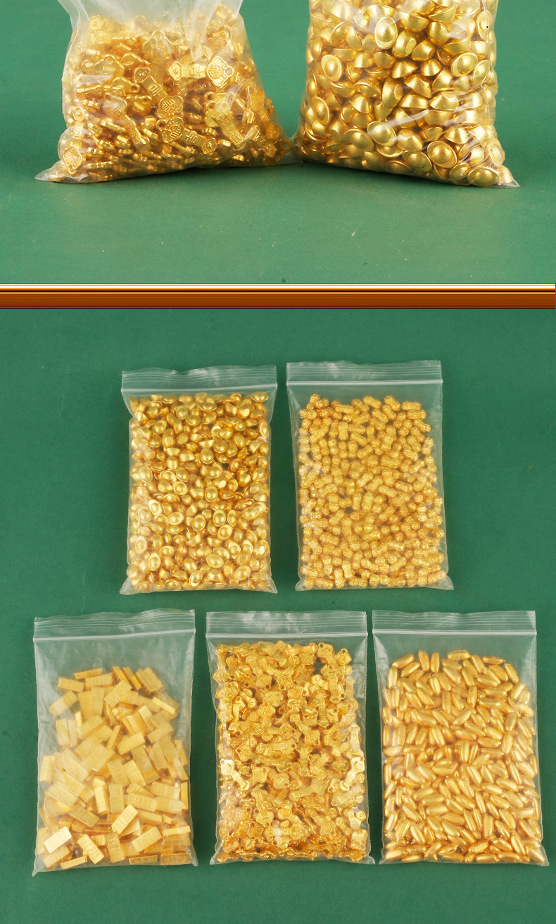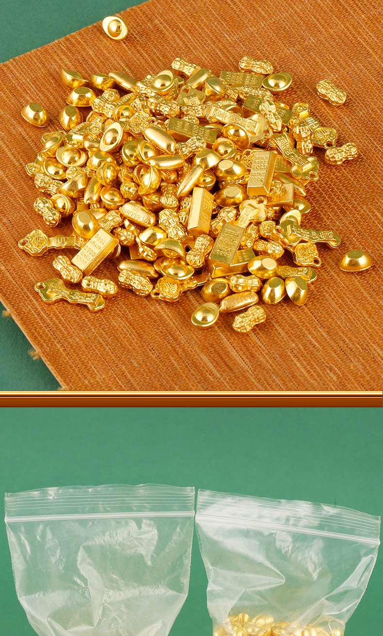 颜色 小元宝配件100g袋装约113个,花生配件100g袋装约120个,大米配件100g袋装约123个,小如意配件100g袋装约98个,小金砖配件100g袋装约66个,金色塑料小元宝配件100g袋装约660个,金色塑料铜钱配件100g袋装约100个