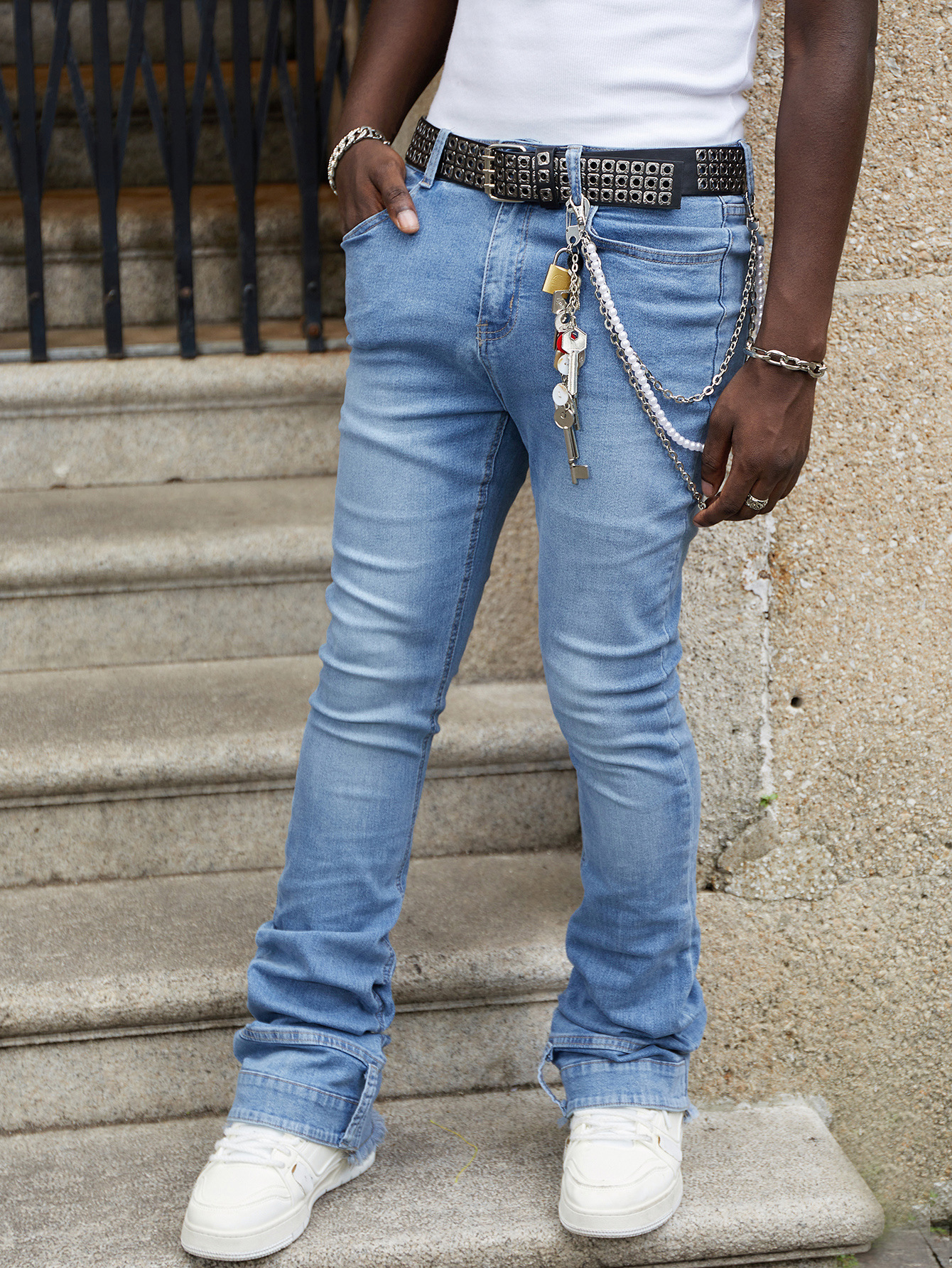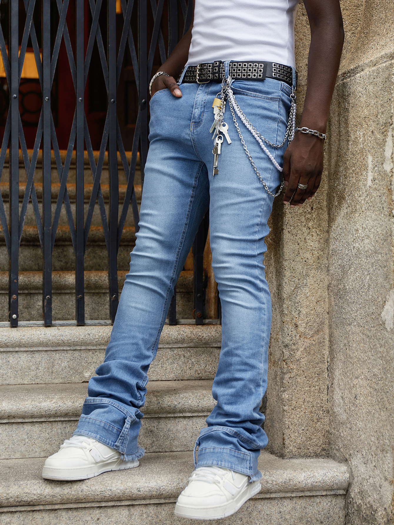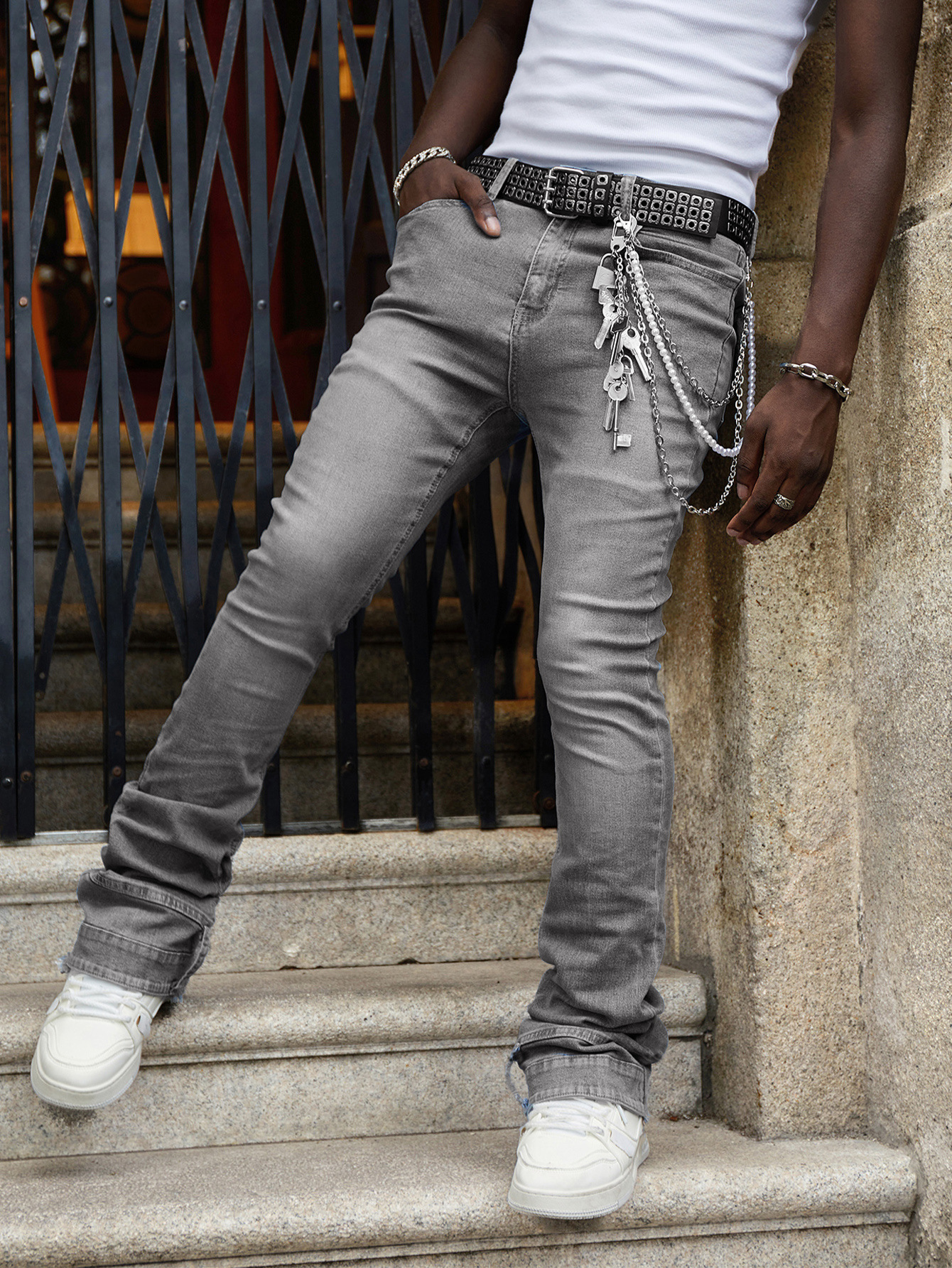 跨境新款男士牛仔直筒裤欧美街头时尚ins爆款弹力贴布牛仔堆叠裤