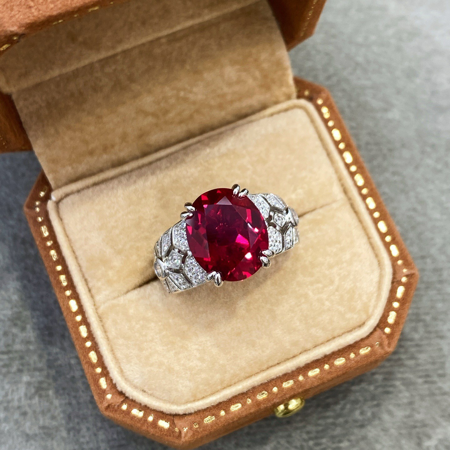瑞钻珠宝新品实验室培育红宝石戒指椭圆形6克拉文艺复古S925纯银