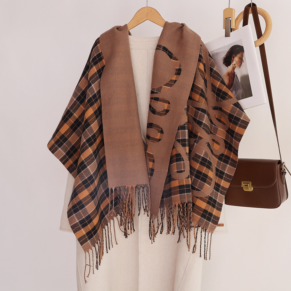 格纹字母高档围巾女秋冬时尚百搭流苏仿羊绒披肩外搭双面保暖围脖