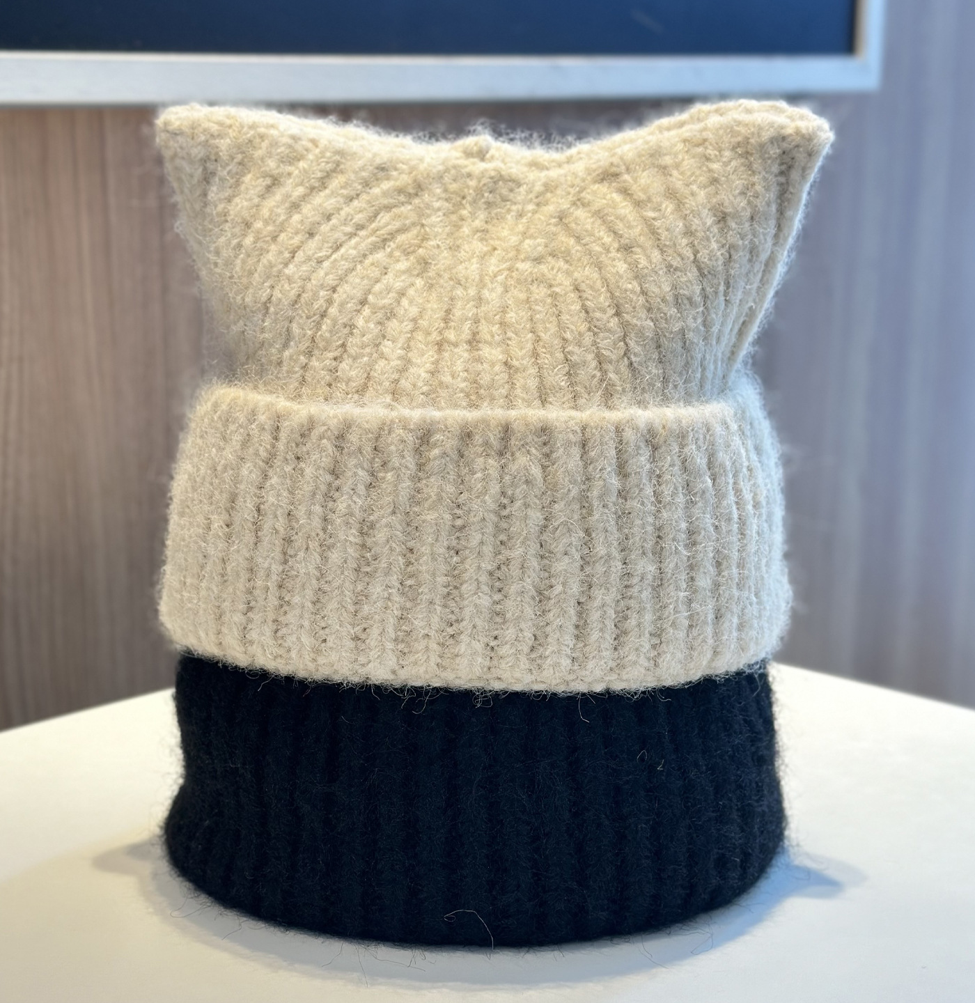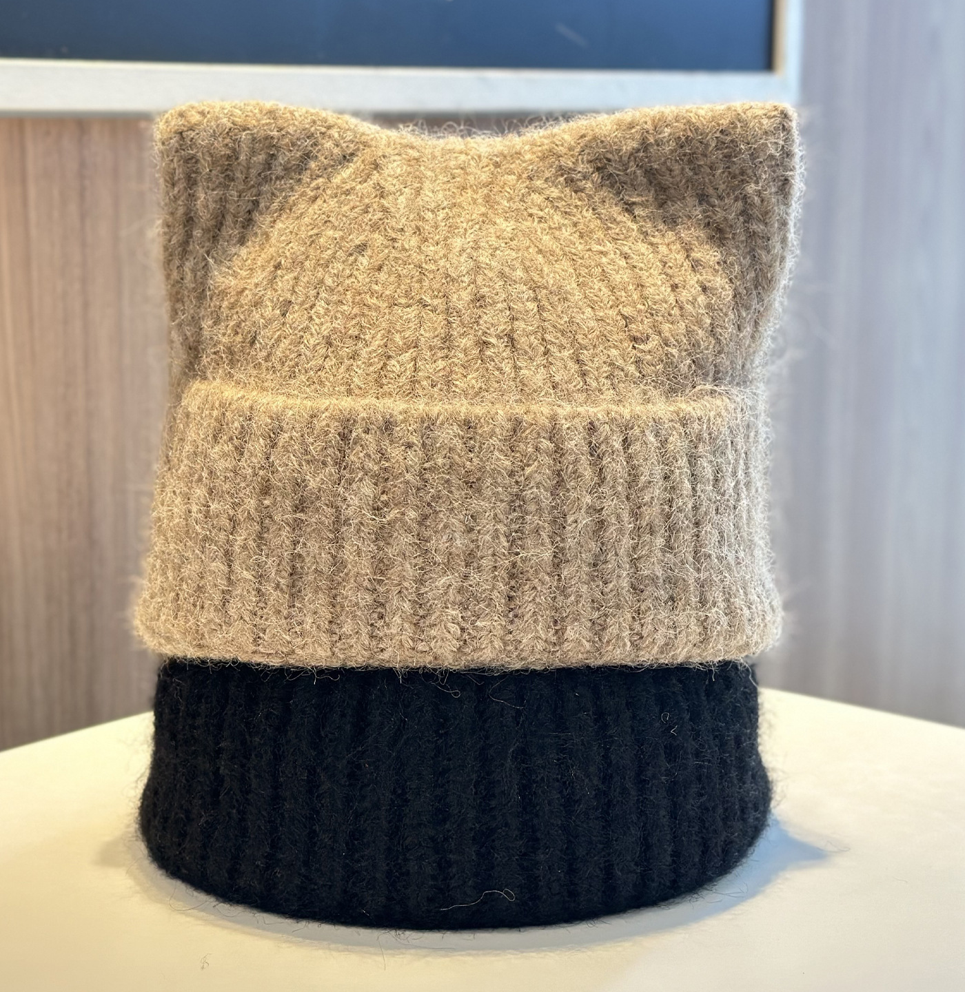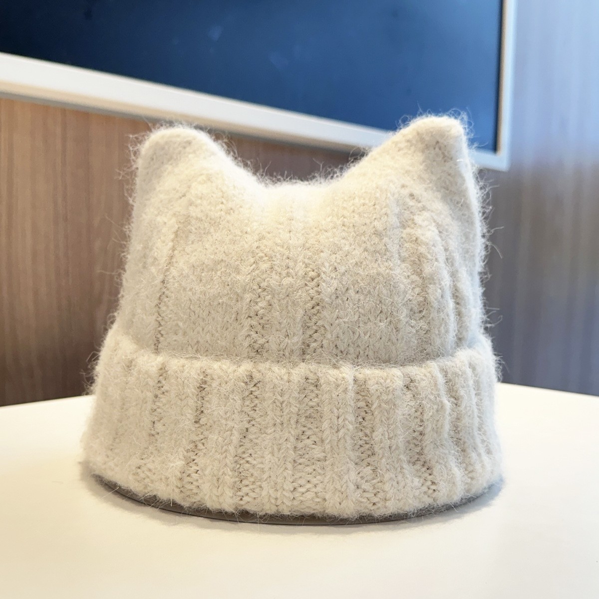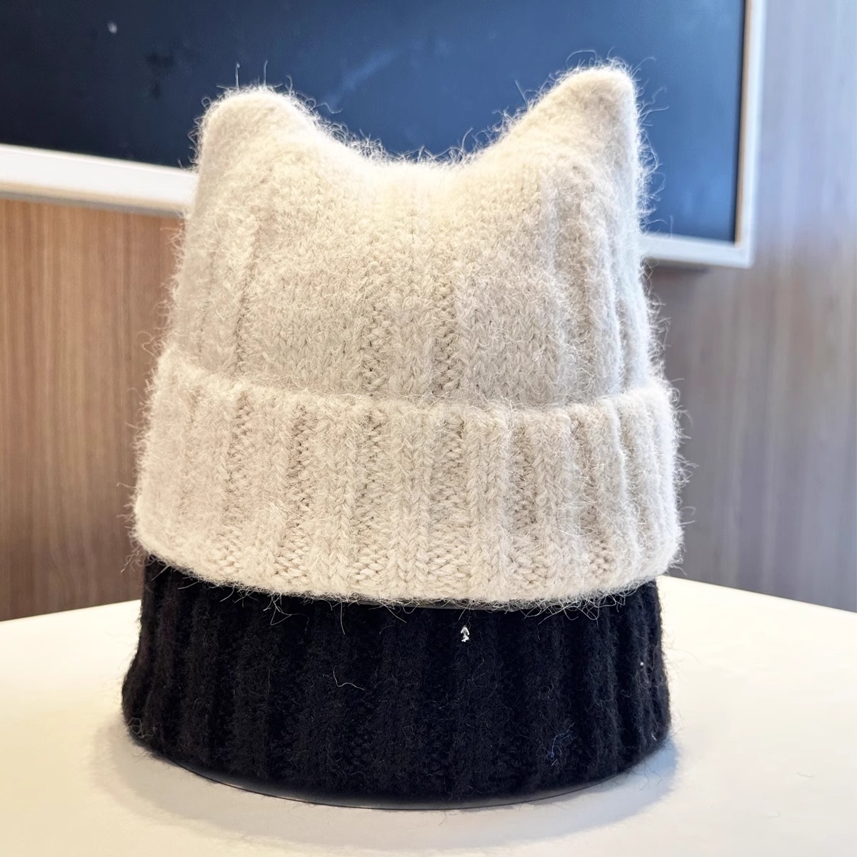 新款羊毛混纺浣熊纯色针织帽子女秋冬季柔软毛线可爱超萌猫耳朵帽