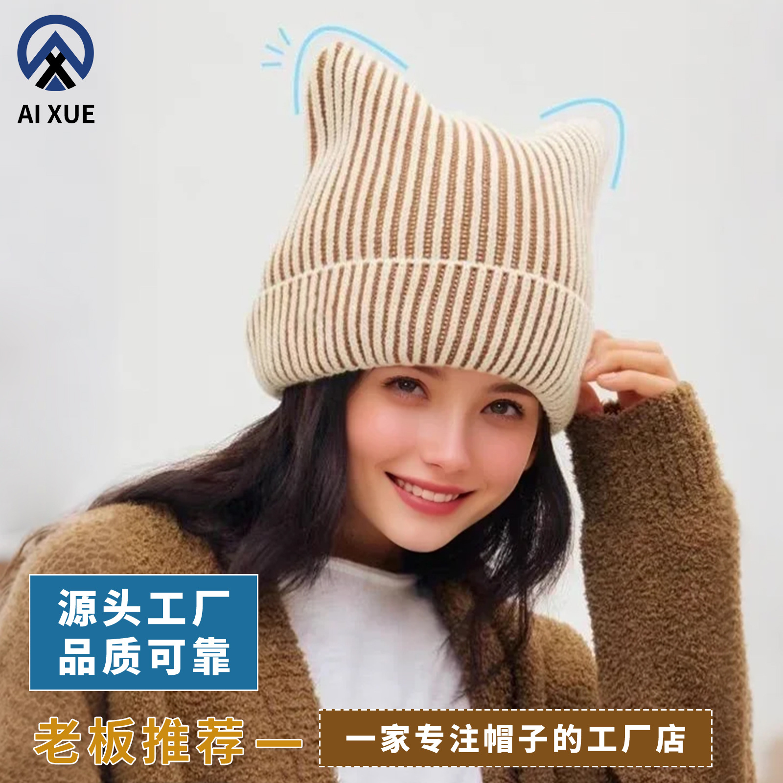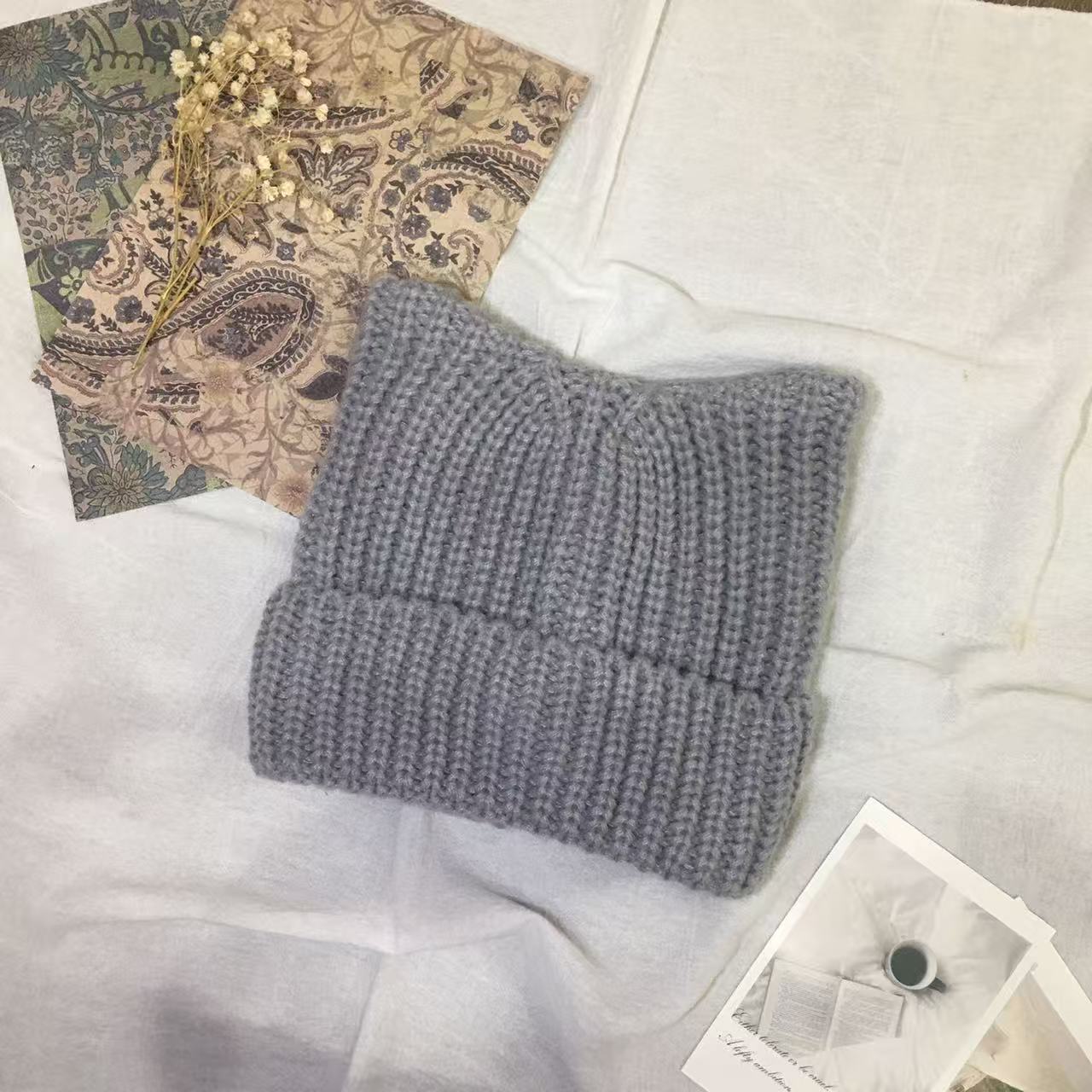 秋冬新款可爱猫耳大版针织帽甜美百搭翻檐户外保暖防寒套头毛线帽