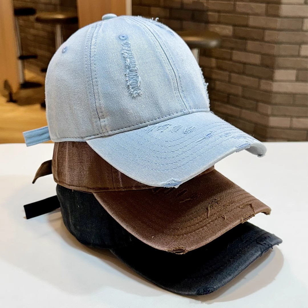 韓国版は古い穴を割った野球の帽子をしています。