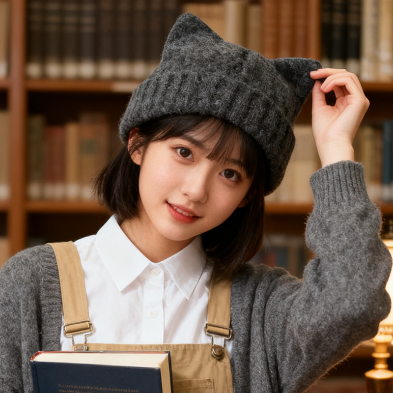 猫耳针织帽子女秋冬季防寒保暖甜美可爱时尚百搭纯色加厚毛线帽男