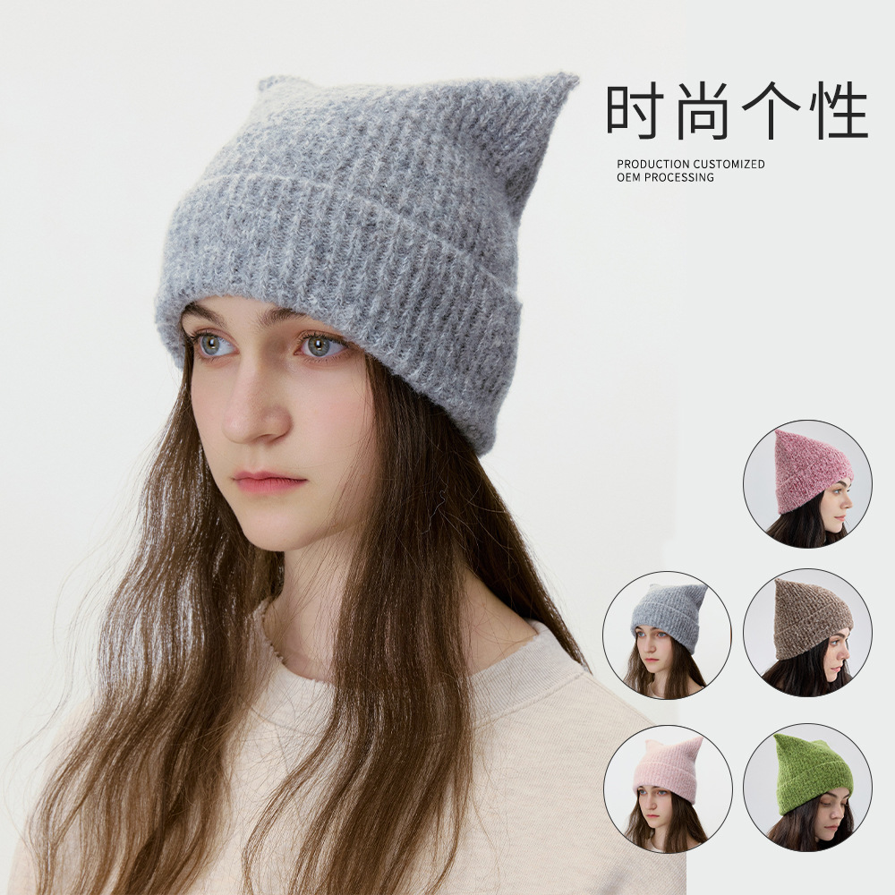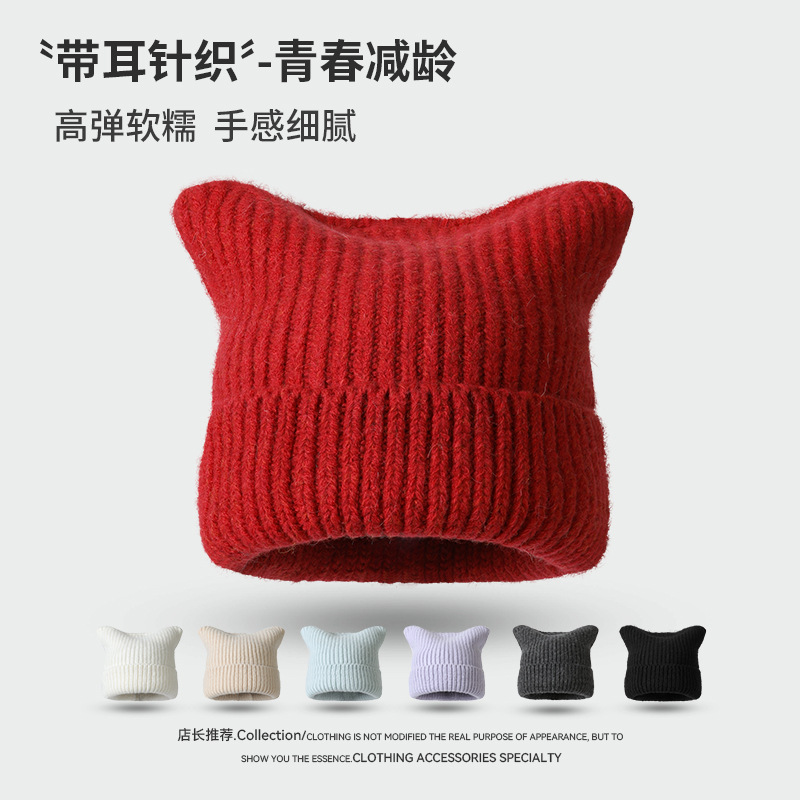 2025新款秋冬韩版毛线帽子女猫耳朵帽子纯色针织套头帽保暖冷帽