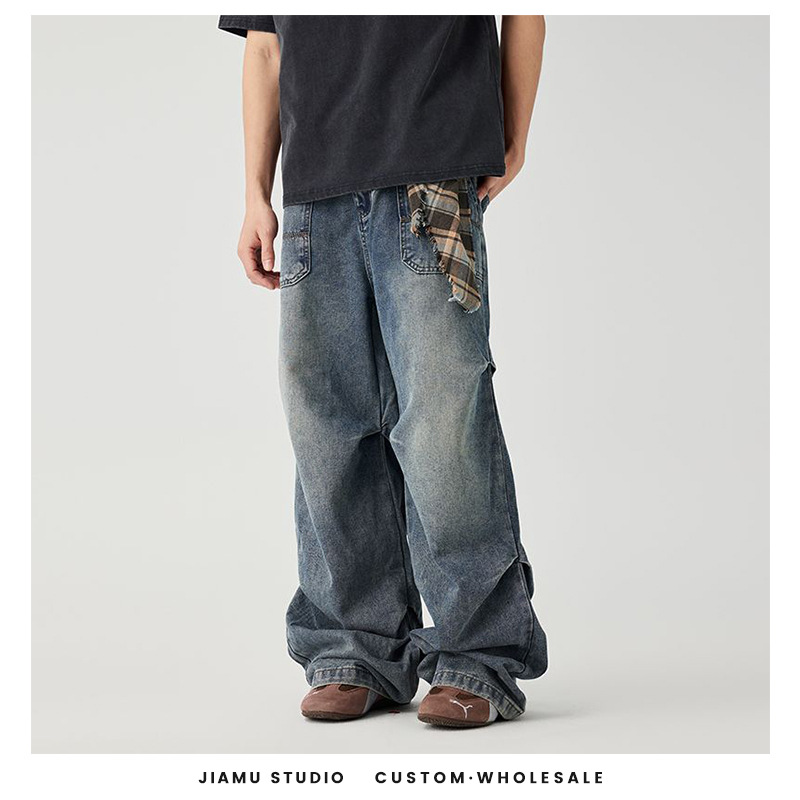 JIAMU美式高街拼接原牛baggy jeans中性镰刀裤阔腿弯刀牛仔裤男女