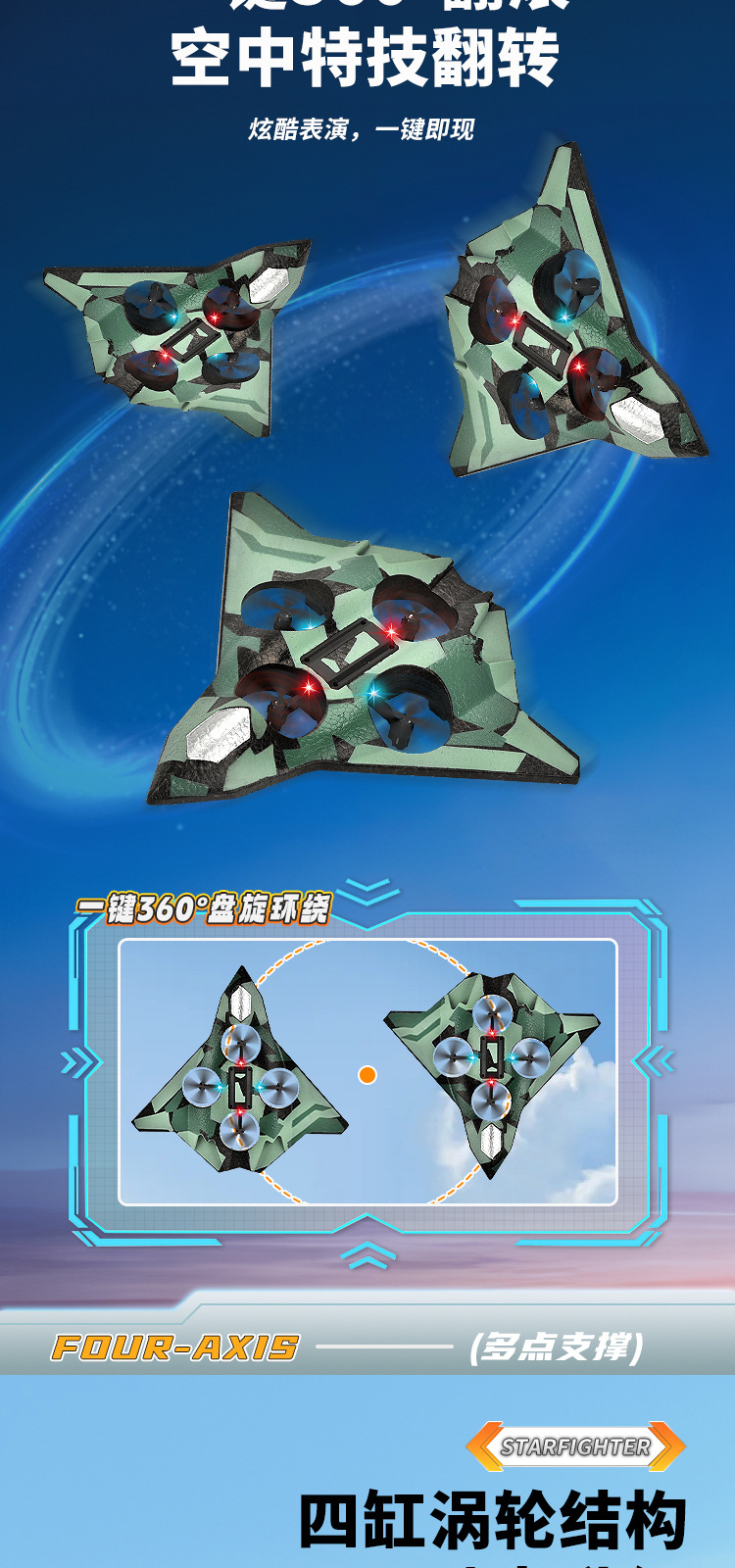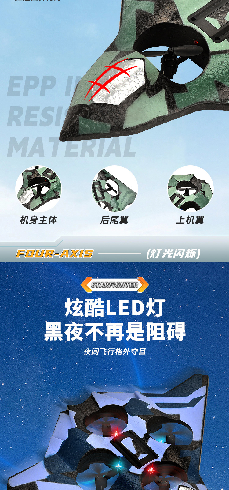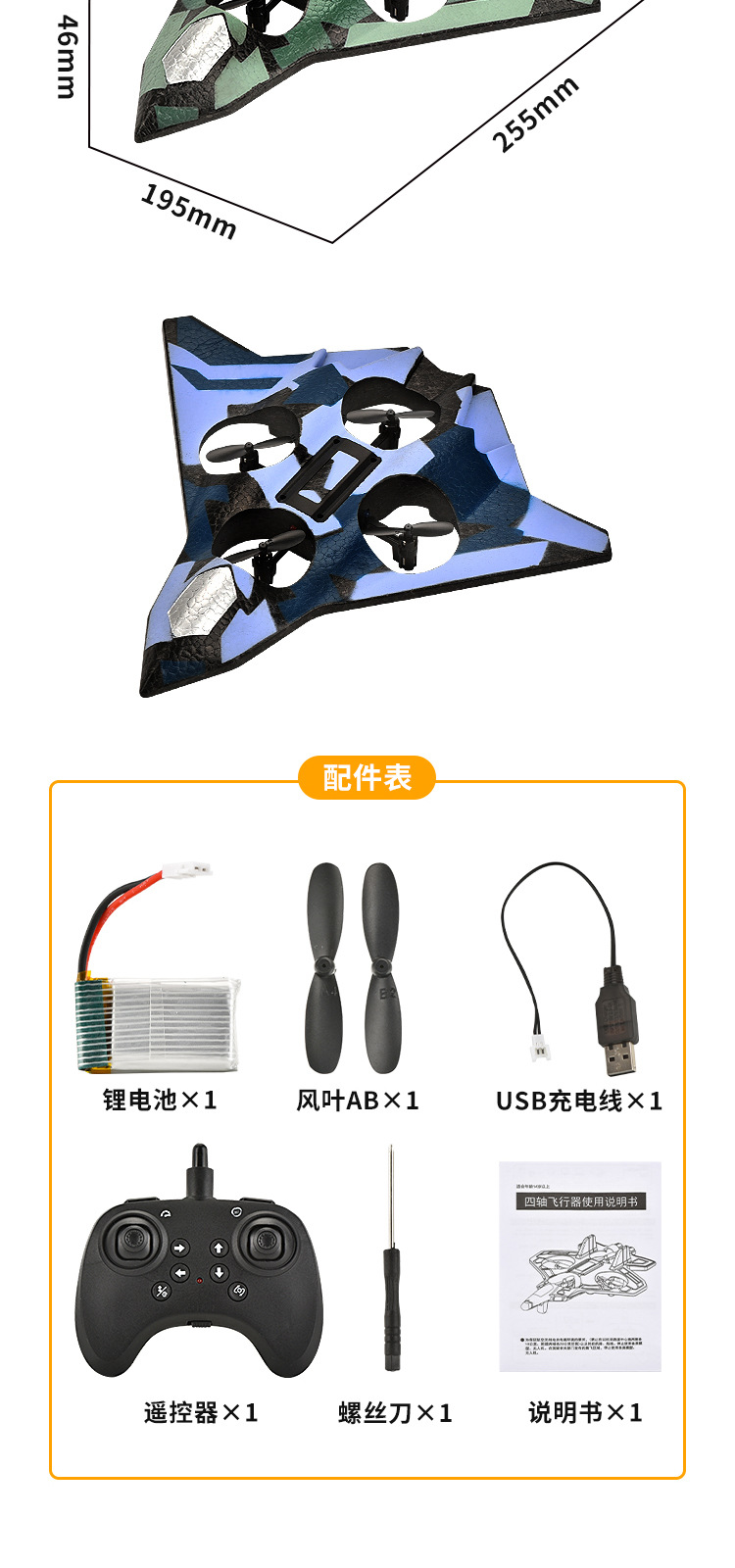 包装清单 飞行器*1 ,遥控*1,锂电池*1,充电线*1,扇叶*4 产品功能 重力感应,上升/下降,左转/右转,前进/后退左右侧飞飞,3D翻滚,翻滚转换,无头模式,一键返航,速度切换,炫酷灯光,一键起落,无头模式,耐撞耐摔