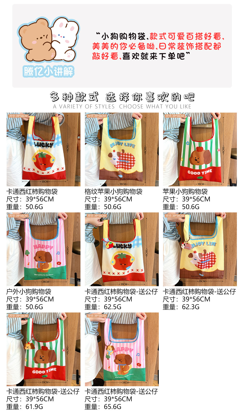 颜色 1#卡通西红柿购物袋,2#格纹苹果小狗购物袋,3#苹果小狗购物袋,4#户外小狗购物袋,5#卡通西红柿购物袋-送公仔,6#格纹苹果小狗购物袋-送公仔,7#苹果小狗购物袋-送公仔,8#户外小狗购物袋-送公仔,1#蓝黄小猫-购物袋,2#粉白小狗-购物袋,3#涂鸦插画-购物袋,4#黑色猫咪-购物袋,1#绿色-春日苹果购物袋,2#红色-苹果西高地购物袋,3#黄色-音乐小狗购物袋,4#蓝色-艺术家小狗购物袋